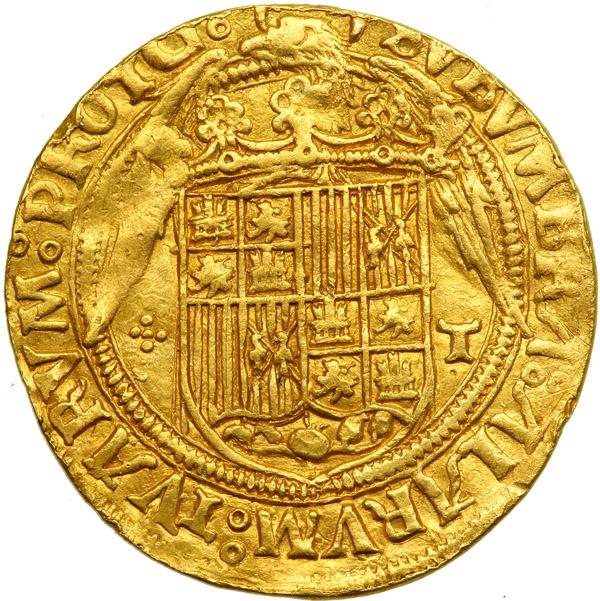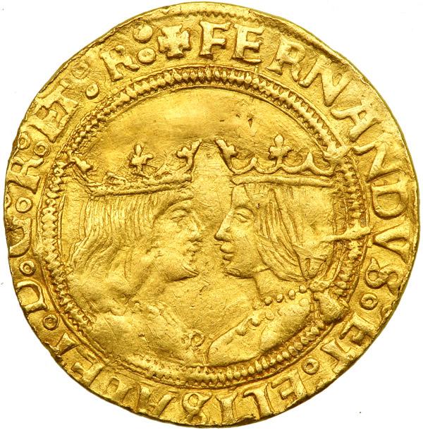 Spain. 2 Excelentes, ND (Toledo). Fr-130; Cayon-2946. Fernando V and Isabel I, 1476-1516. Crowned facing busts. Reverse: Arms on eagle. NGC graded Extremely Fine, Details (Obverse Repaired).