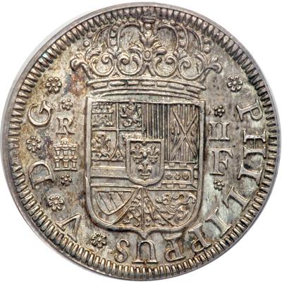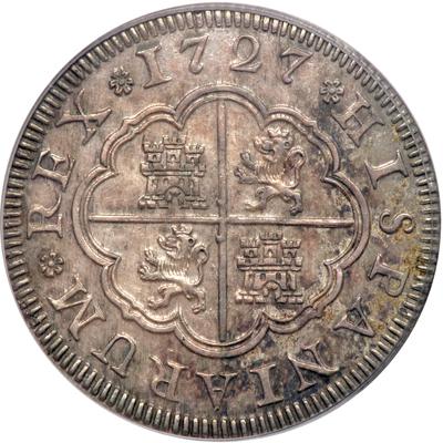 Spain. 2 Reales, 1727-F (Segovia). KM-297; Cayon-Type 63. Philip V, 1700-1746. Crowned arms. Reverse: Cross with castles and lion in angles. Sharply struck and deeply toned. PCGS graded MS-63.