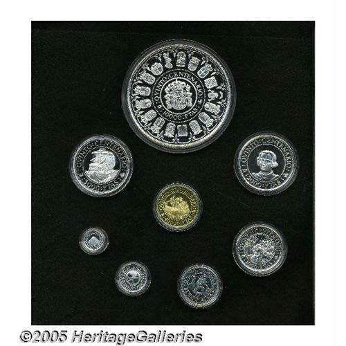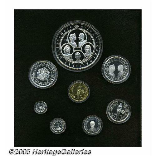<B>500th Anniversary of Discovery Set</B></I> 1989, Proof including 100 Pesetas KM834, 200 Pesetas KM835, 500 Pesetas KM836, 1000 Pesetas KM837, 2000 Pesetas KM838, 5000 Pesetas KM839, 10,000 Pesetas KM841 and 40,000 Pesetas KM844. The coins are housed in the original wooden box of issue including the certificate of authenticity.