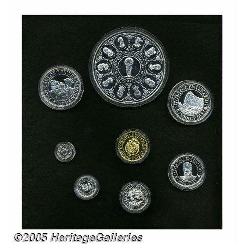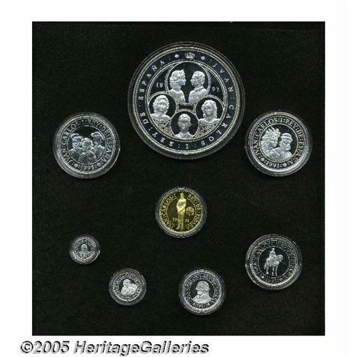 <B>500th Anniversary of Discovery Set</B></I> 1991, Proof including 100 Pesetas KM882, 200 Pesetas KM883, 500 Pesetas KM885, 1000 Pesetas KM886, 2000 Pesetas KM892, 5000 Pesetas KM893, 10,000 Pesetas KM896 and 40,000 Pesetas KM900. The coins are housed in the original wooden box of issue including the certificate of authenticity.