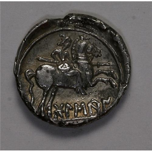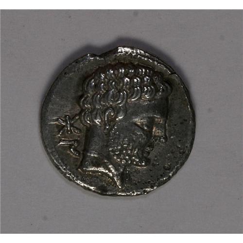 <B>Spain, Bolskan.</B></I> 80-72 B.C. AR denarius (18 mm, 3.57 g). Bearded male head right / Horseman galloping right, holding spear. CNH p. 212, 12; SNG BM 743-4. Lightly toned VF, edge chip, porosity.