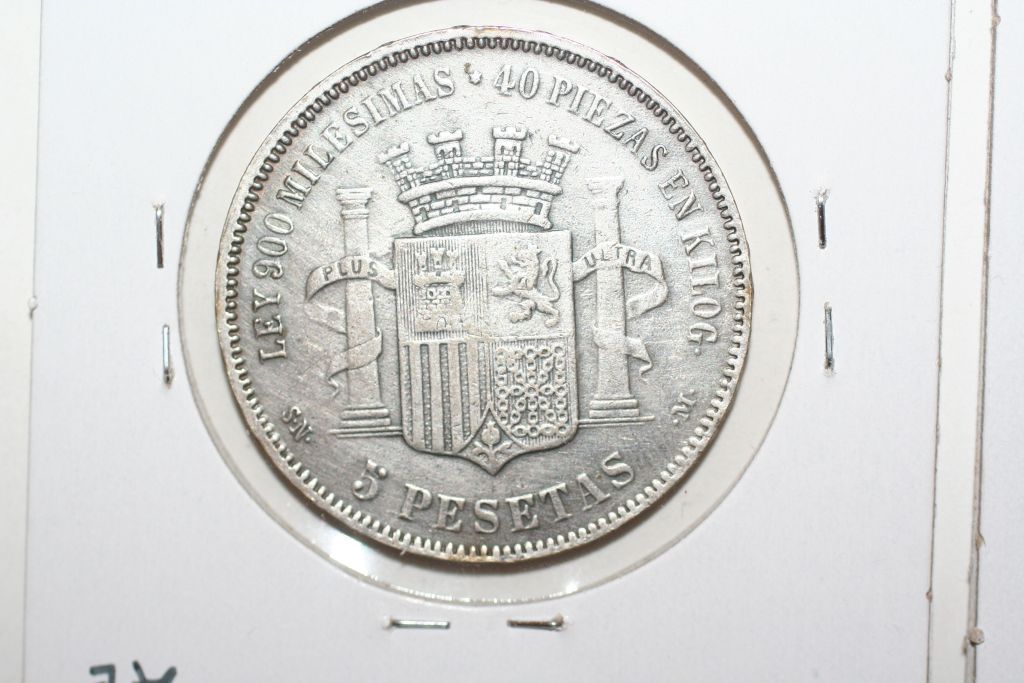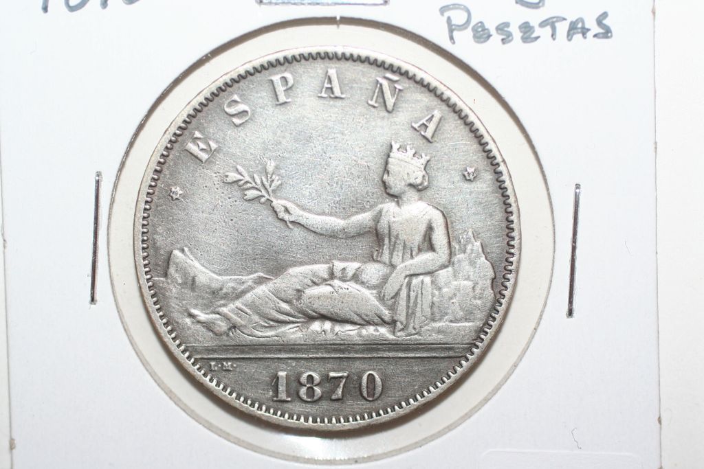 This lot is an 1870 espana 5 pesetas silver coin