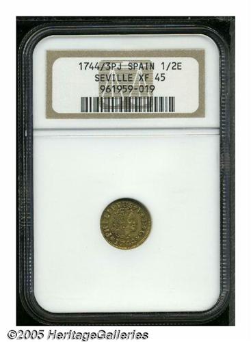 <B>Felipe V Gold 1/2 Escudo 1744/3 S-PJ,</B></I> Fr-240, KM361.2, XF45 NGC. A very bold and unlisted overdate.