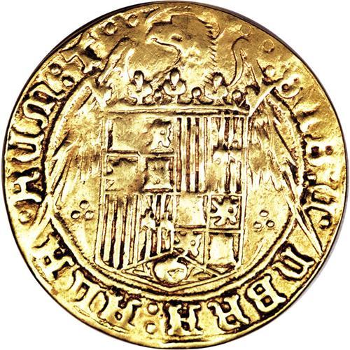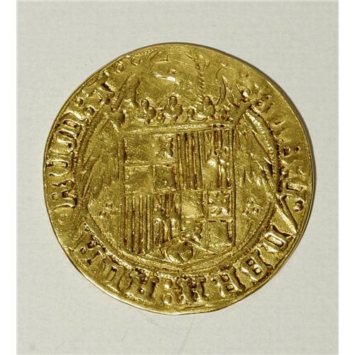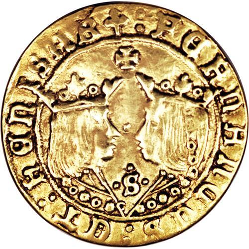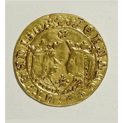<B>Fernando and Isabel gold 2 Excelentes ND (1474-1504),</B></I> Facing busts/Crowned shield, Fr-129, Cal-60, Seville Mint, 6.88g, cleaned VF, possibly removed from jewelry, but with near-full, clear legends and no obvious damage.<BR><BR><b>Shipping:</b> Coins & Currency (<a target="_blank" href="http://www.heritageauctions.com/common/shipping.php">view shipping information</a>)