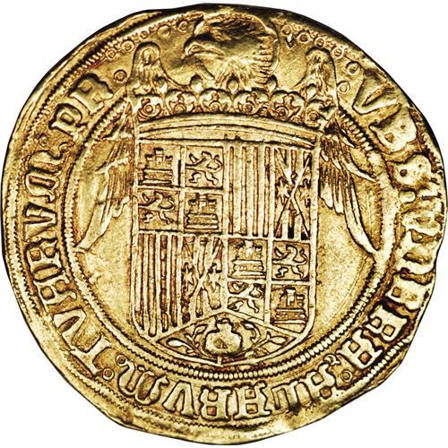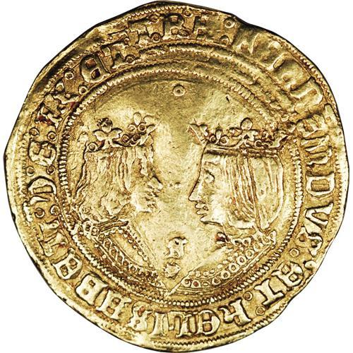 <B>Fernando and Isabel gold 2 Excelentes ND (1474-1504),</B></I> Facing busts/Crowned shield, Fr-129, Cal-51a var, Seville Mint, 6.92g, VF with an obvious double striking.<BR><BR><b>Shipping:</b> Coins & Currency (<a target="_blank" href="http://www.heritageauctions.com/common/shipping.php">view shipping information</a>)