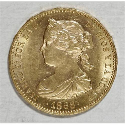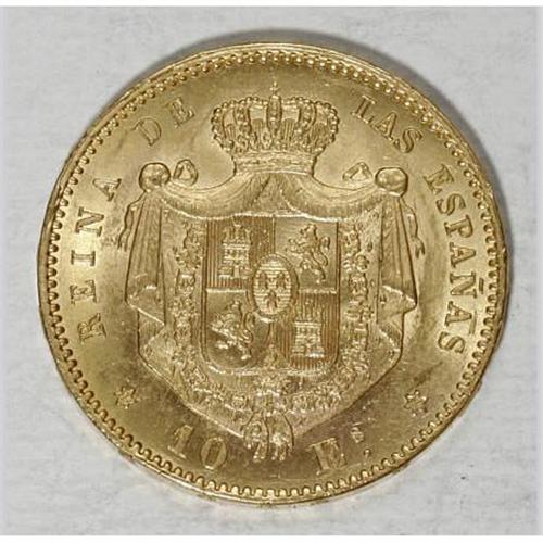 <B>Isabel II gold 10 Escudos 1868 (73) Madrid,</B></I> KM636.3, fully lustrous AU-UNC, a very appealing coin with excellent "flash." Star date (18)73 in the six pointed star mintmark.<BR><BR><b>Shipping:</b> Coins & Currency (<a target="_blank" href="http://www.heritageauctions.com/common/shipping.php">view shipping information</a>)