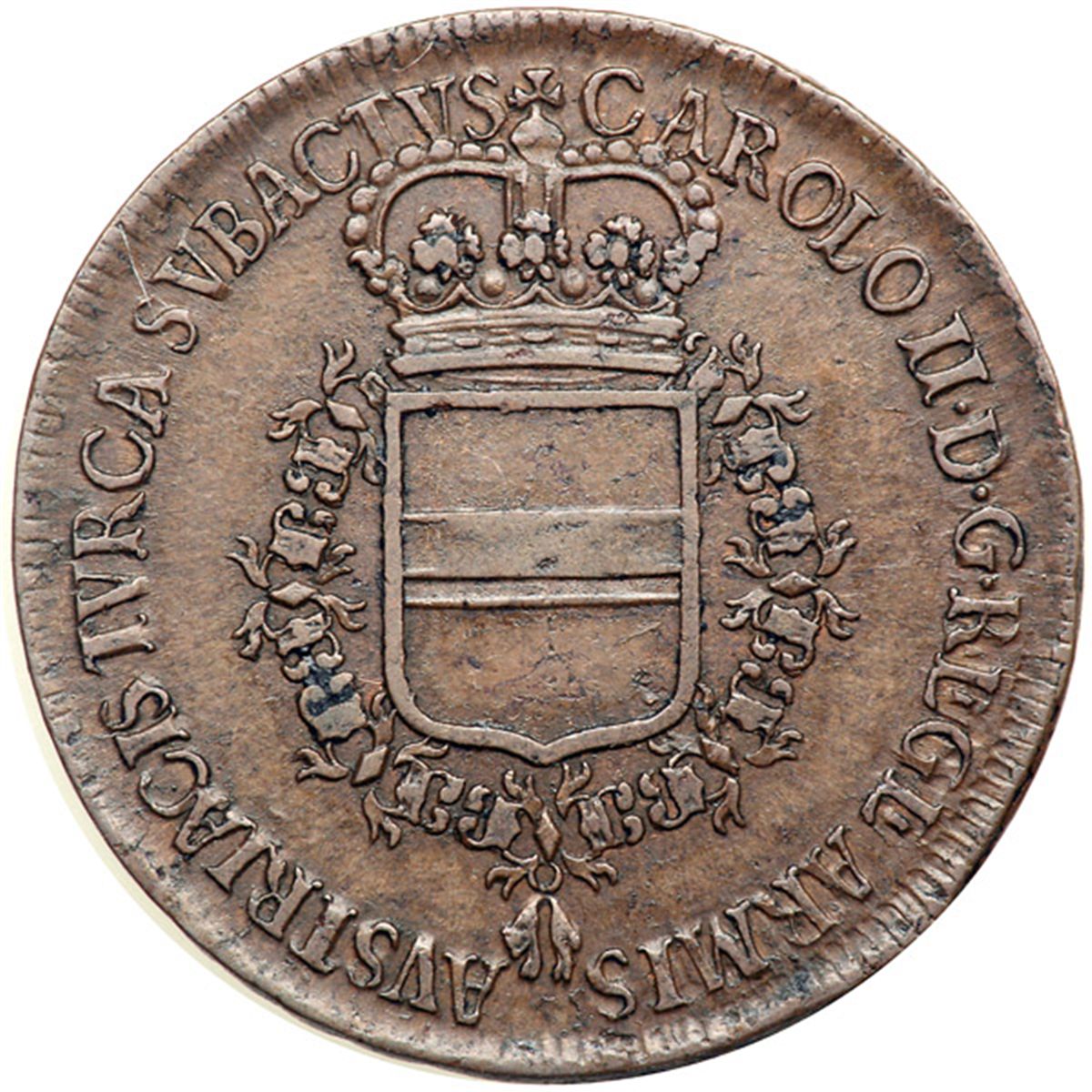 Spain. Jeton, 1686. Montenuovo-1042; Slg.Julius-306; Horsky-2141. Copper. 29 mm. Austrian Tribute to King Charles II of Spain. Obverse: Crowned Austrian shield in golden Fleece, Latin Tribute to King Charles II from Austrian Forces Battling the Turks. Reverse: Radiant sun over declining moon (Turks), symbol of ultimate Christian triumph. About Extremely Fine.