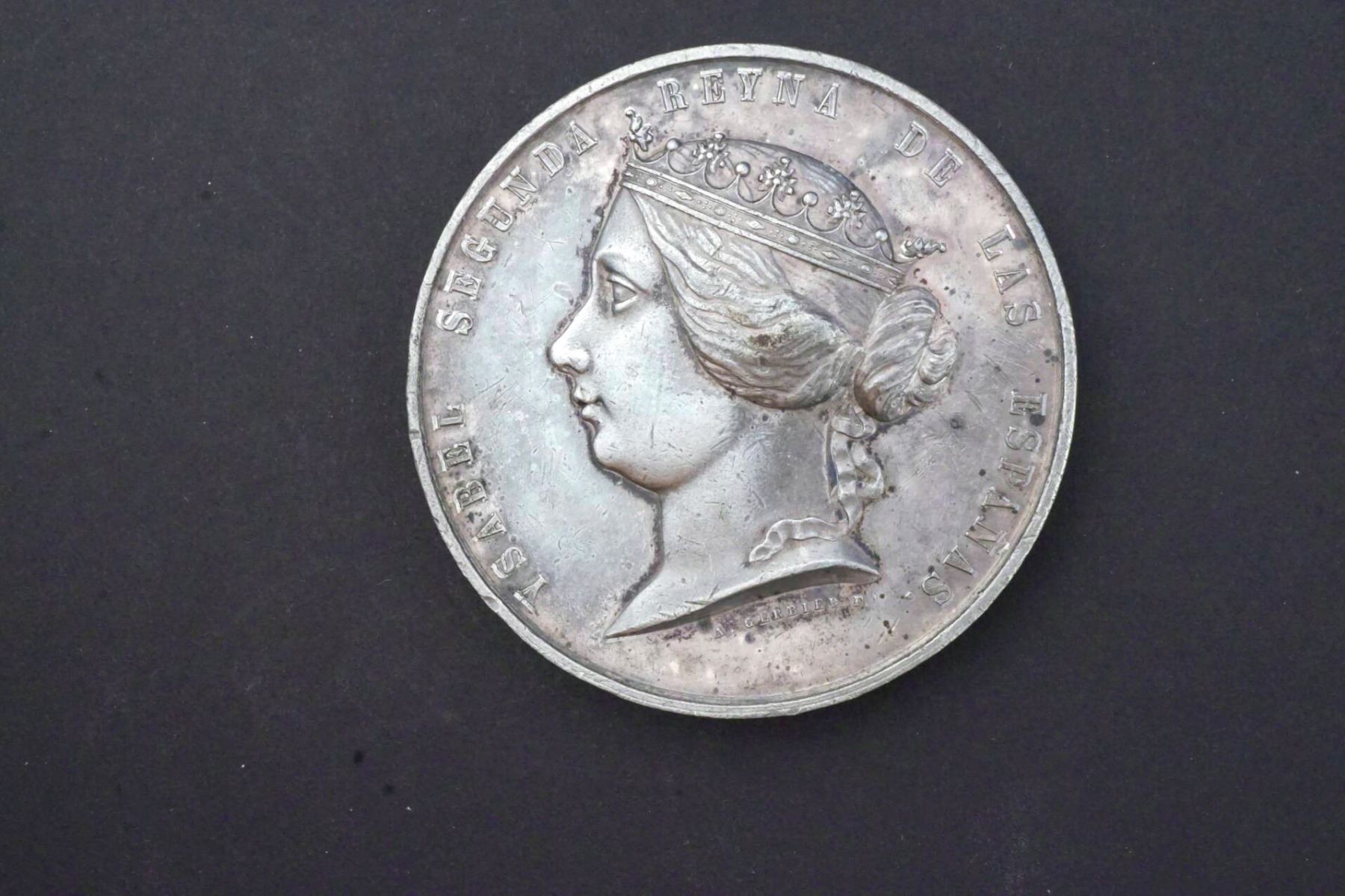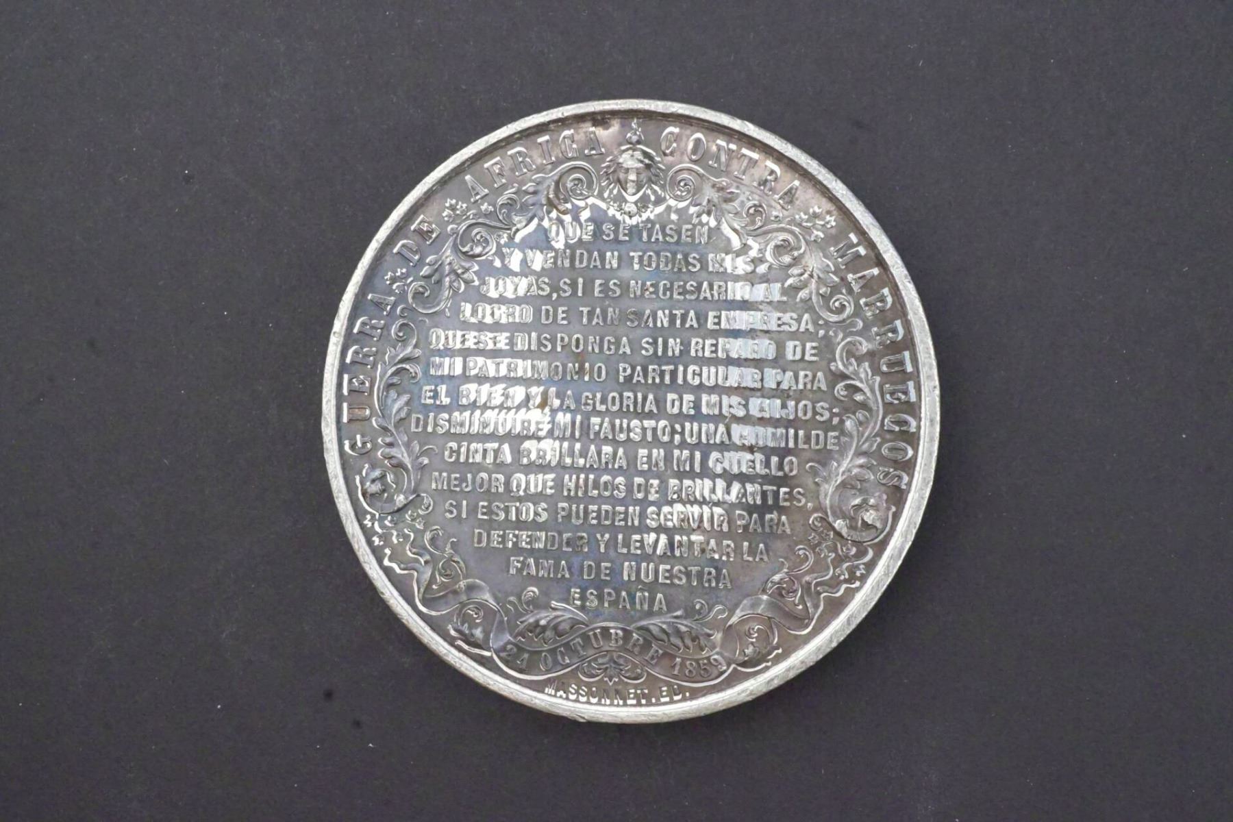 Pewter, 57 mm. 77.2 grams. Bust of the Queen, left.Below: A. CERBIER F. ISABEL SEGUNDA REYNA DE LAS ESPANAS. Reverse: GUERRE DE AFRICA CONTRA MARRUECOS Wreath around text, EF.Below: MASSONNET. ED.
