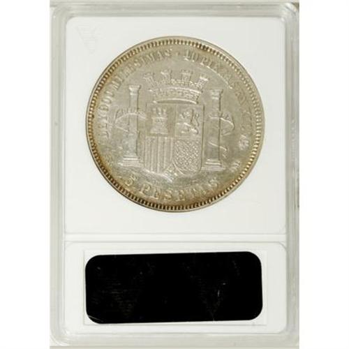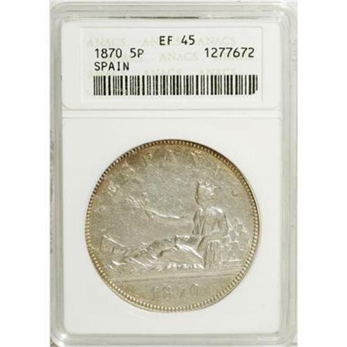 <B>Provisional 5 Pesetas 1870(70),</B></I> KM655, XF45 ANACS.<BR><BR><b>Shipping:</b> Coins & Currency (<a target="_blank" href="http://www.heritageauctions.com/common/shipping.php">view shipping information</a>)