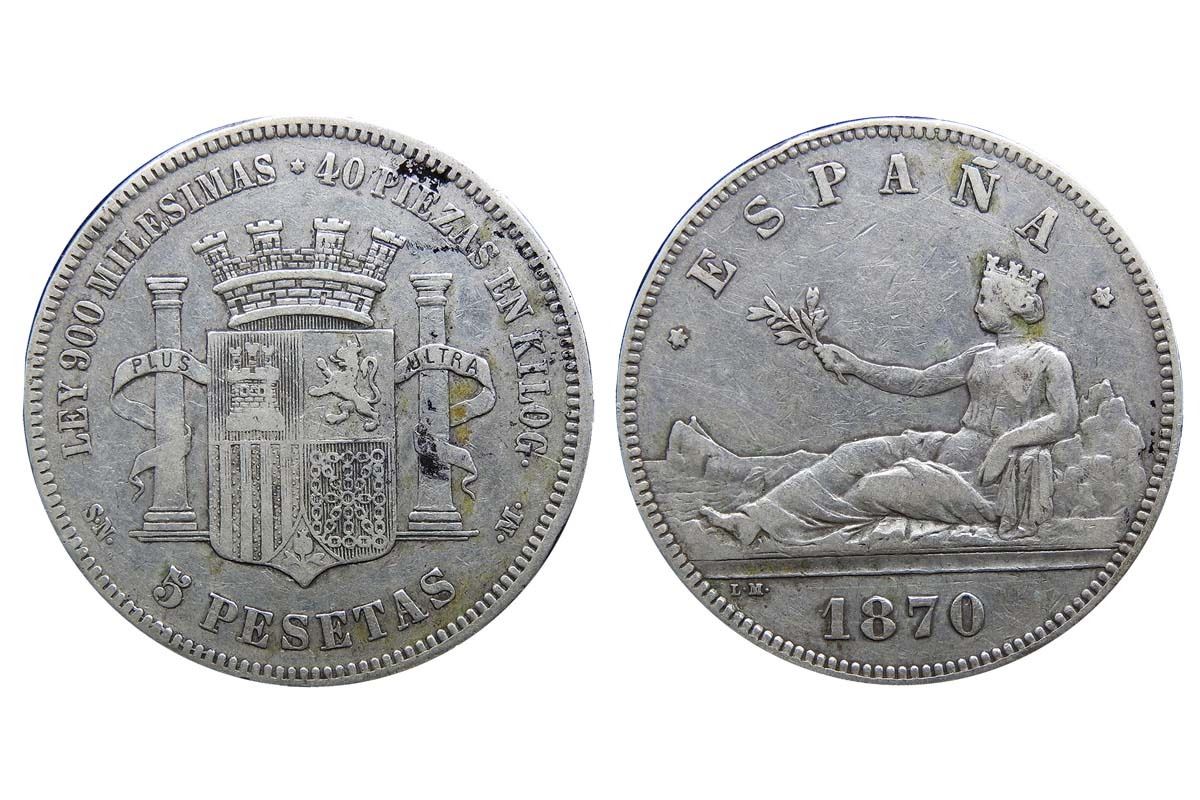 Spain, Provisional Govt. Issue, (c. 1869-1871), Silver 5 Pesetas, 1870, 24.7 grams, 37mm x 2mm, Obv. Reclining Hispania between Pyrenees and Gibraltar above date (The design is based on coins of the Roman Emperor Hadrian), Rev. Portugal coats of arms in centre crowned with pillars beside and entwined ribbon, (KM 655), UNC, Rare.
