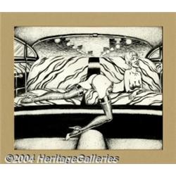 Spain Rodriguez - Original Illustration (Unpublished). Known for his love of both cars and beautiful women, this piece by Spain combines the best of both worlds, featuring a naked woman laying across an impossibly huge backseat. Spain draws with such detail you can almost touch the carpet. In excellent condition, this piece is matted to an overall size of 12" x 14", with an image area of 8" x 9". Important notice: Heritage usually auctions material at the rate of 200-250 lots per hour. On some occasions eBay Live bid software or the Internet may not be able to keep up with the pace of the auction. We recommend placing a realistic absentee bid now as insurance to avoid disappointment. Occasionally the auctioneer may eliminate or reject an eBay Live bid, and the auctioneer may also reopen a lot after the close of the eBay live bidding (usually because we missed an audience bid), and may reject your bid even if it shows you as the winning bidder. By bidding via eBay Live, you agree that Heritage may award the lot to another bidder at its sole discretion under the circumstances described above or any other reasonable circumstances. Since eBay bids are not shown to us until we open the lot on the floor, we treat those bids just like floor bids. In most cases the floor responds before the eBay bid is presented to us, due to Internet lag time, so for consistency we have made it a policy that floor bids are always considered first over tie eBay live bids. Also please note that all Heritage lots purchased through eBay Live carry a 20% Buyer's Premium. Please make sure you read the Terms and Conditions before you bid.