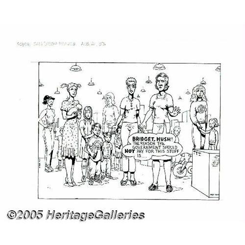 <B>Spain Rodriguez - San Diego Reader Cover Original Art (San Diego Reader, 2003).</B></I> " "<B>San Diego Reader</B></I> is a weekly publication that covers San Diego life in general, with emphasis on local arts and entertainment, politics and events. This nicely detailed editorial cover illustration is by legendary " "<B>Zap Comix</B></I> artist Spain, created for the August 21, 2003 edition. The image area measures approximately 8.5"" x 6"" and is in Excellent condition. <BR><BR><B>Important notice:</B> Heritage usually auctions material at the rate of 200-250 lots per hour. On some occasions eBay Live bid software or the Internet may not be able to keep up with the pace of the auction. We recommend placing a realistic absentee bid now as insurance to avoid disappointment. Occasionally the auctioneer may eliminate or reject an eBay Live bid, and the auctioneer may also reopen a lot after the close of the eBay live bidding (usually because we missed an audience bid), and may reject your bid even if it shows you as the winning bidder. By bidding via eBay Live, you agree that Heritage may award the lot to another bidder at its sole discretion under the circumstances described above or any other reasonable circumstances. Since eBay bids are not shown to us until we open the lot on the floor, we treat those bids just like floor bids. In most cases the floor responds before the eBay bid is presented to us, due to Internet lag time, so for consistency we have made it a policy that floor bids are always considered first over tie eBay live bids. Also please note that all Heritage lots purchased through eBay Live carry a 20% Buyer's Premium. Please make sure you read the Terms and Conditions before you bid. This lot is being auctioned in conjunction with a live floor auction by Heritage Galleries & Auctioneers. All final auction and invoice information will be supplied by Heritage Galleries & Auctioneers, and all other information should be considered preliminary. Lot:436