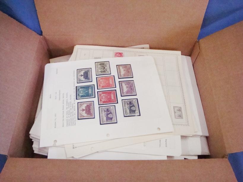Useful lot of many (100) stamps, unused and used, Spain and colonies on pages, in envelopes, in glassines,etc. Wide range of material with much to sort through. take a look. Est.$75-125