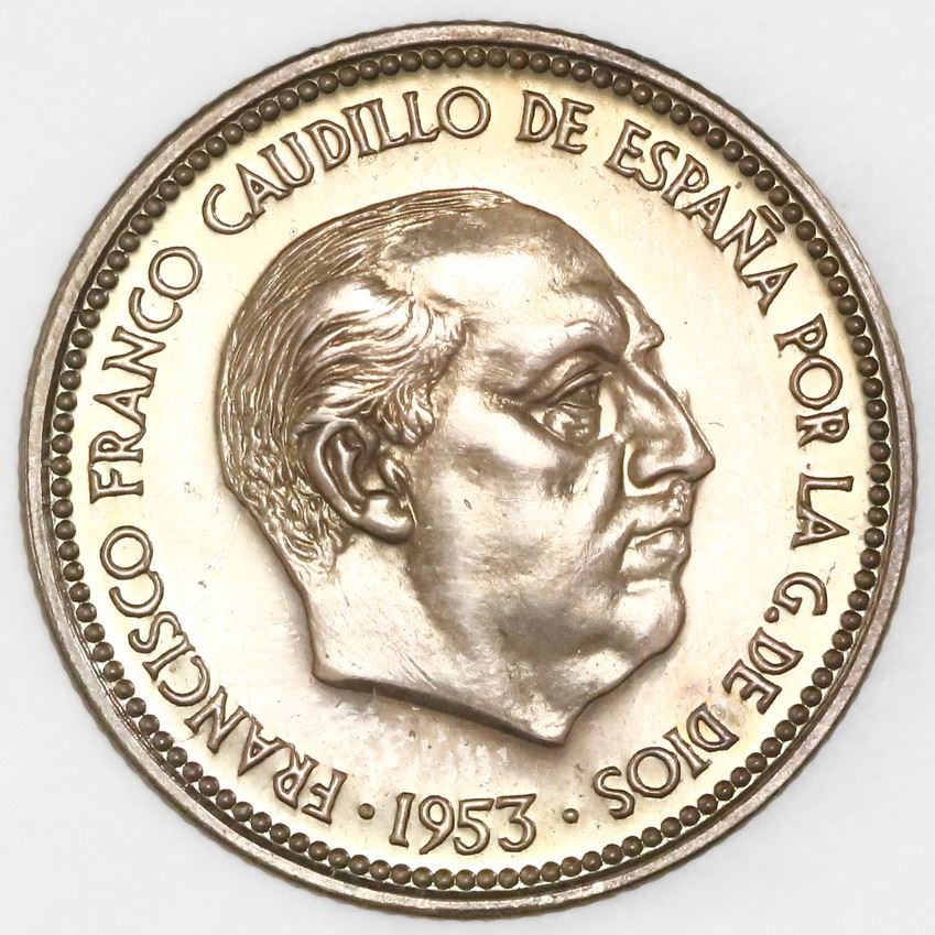 Spain, proof 2-1/2 pesetas, 1953 with 19-56 inside stars, NGC PF 66, finest and only known example i