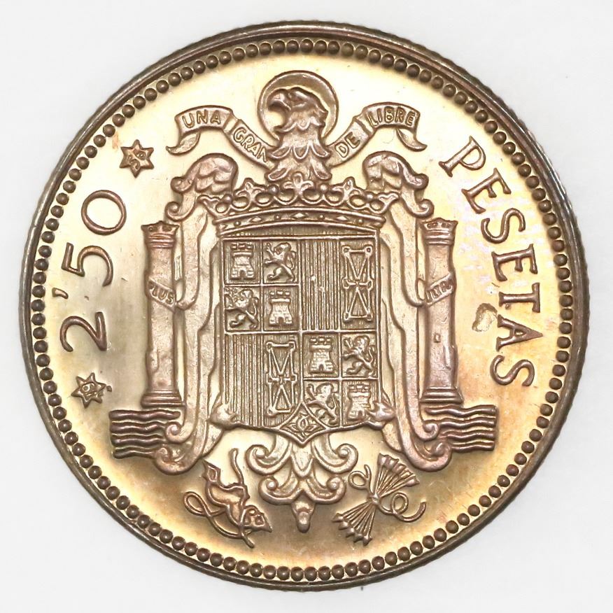 Spain, proof 2-1/2 pesetas, 1953 with 19-56 inside stars, NGC PF 66, finest and only known example in NGC census. CT-69 (but proof); KM-785. Smooth Proof surfaces with rainbow toning over subdued luster, light fingerprint fragment to left of bust, small strike-through error on reverse. NGC #4724632-011.