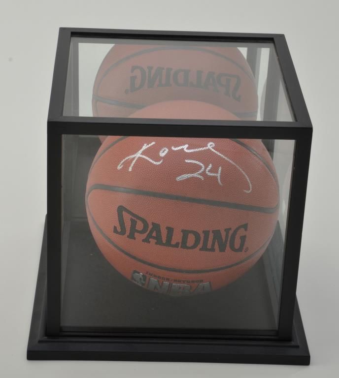 Spalding Basketball autographed by Kobe Bryant of the Los Angeles Lakers with Certificate of Authenticity and packet of information on Kobe’s career and life; ball is also housed in a wood and glass casing. A great piece of sports memorabilia that would be the centerpiece for a fan’s office or den. Est.: $500-$1,000.