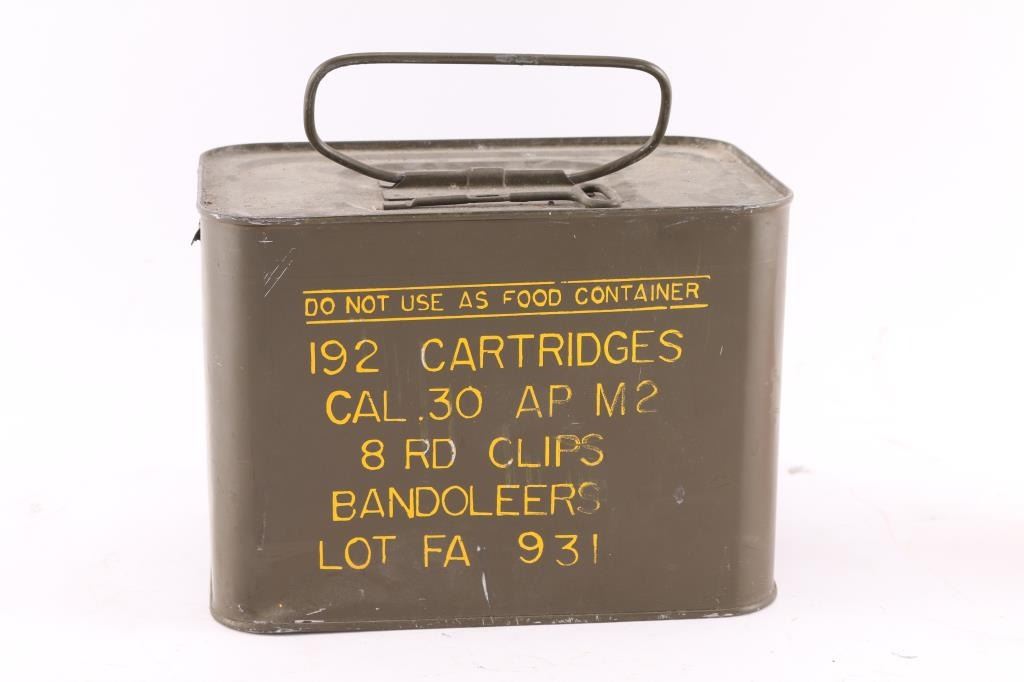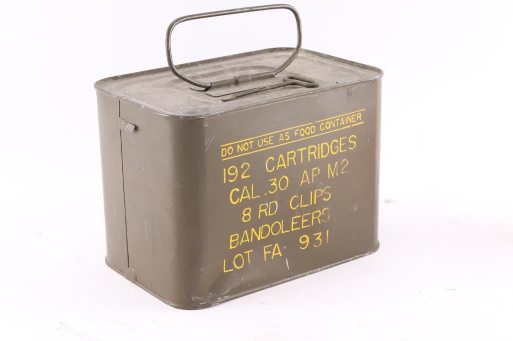 Unopened USGI "Spam Can" of 192 AP M2 .30-06 cartridges in 8 rd clips/Bandoleers.