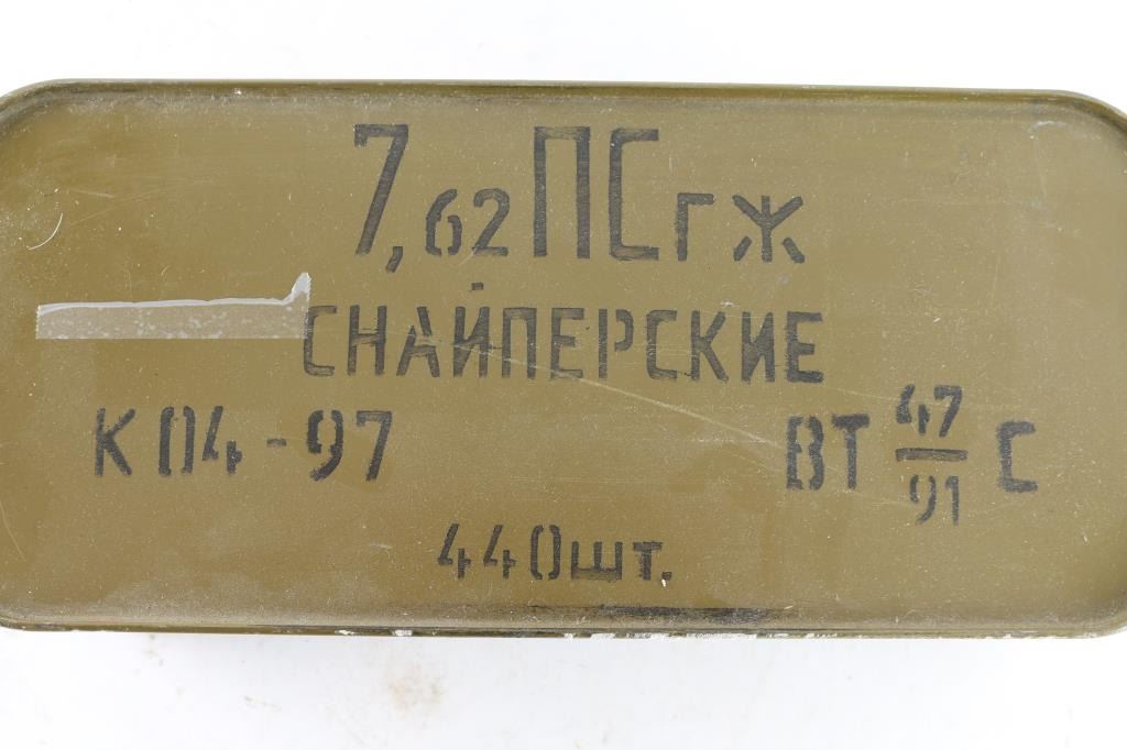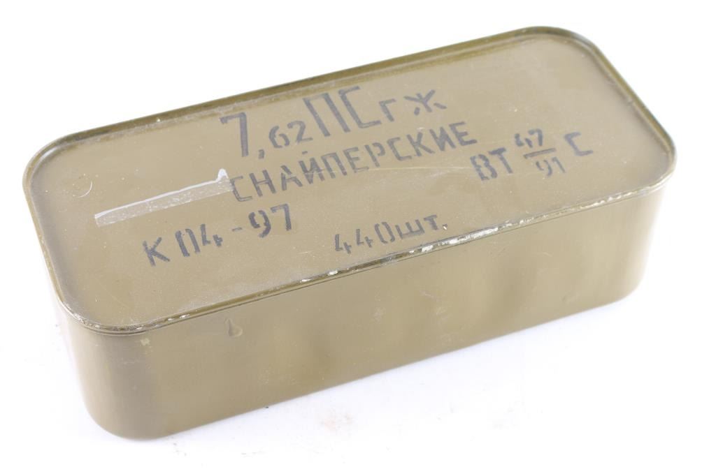 Russian 7N1, 440 rounds in a sealed spam can (unopened). Weighs 23.65 lbs.