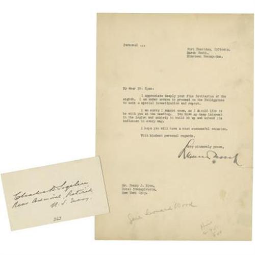 <B>Spanish-American War Signatures: “Rough Rider” Leonard Wood and Charles D. Sigsbee, Captain of the Battleship Maine</B></I>. Includes an autograph card, 4” x 2.75”, signed “<I>Charles D. Sigsbee Rear Admiral, Retired U. S. Navy</B></I>”, toned around the edges, else fine; and a one-page typed letter, 7.25” x 10.5”, Fort Sheridan, Illinois, March 10, 1921, signed “<I>Leonard Wood</B></I>”, to Henry J. Ryan, New York, light stains and toning mainly at the margins, with the usual fold creases, else very good. <I>Ex. Henry E. Luhrs Collection</B></I>.<BR><BR><BR><BR><b>Shipping:</b> Flat Material, Small (<a target="_blank" href="http://www.heritageauctions.com/common/shipping.php">view shipping information</a>)