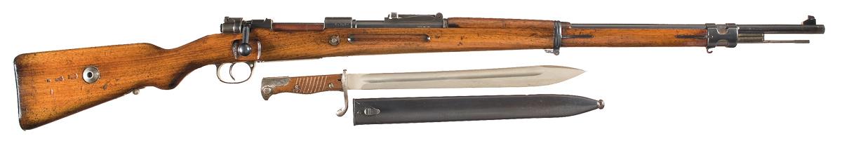 Condition: Good as reworked and subsequently refinished, with half of the blue, showing areas of gray patina, pitting concentrated on the receiver ring and scattered handling marks. Stock is very good, with pressure dents and scuffs. Bayonet blade has been polished, with spotting on the hilt and sheath. Safety is stiff, otherwise mechanically excellent.