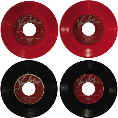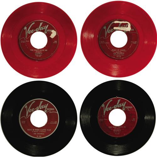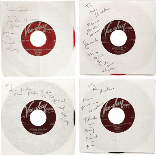 <B>Spaniels Autographed 45 Group of 4 (1953-58).</B></I> Two copies of "Goodnight, Sweetheart, Goodnight"/ "You Don't Move Me" (Vee-Jay 107, 1983), one copy a red vinyl in VG-EX 6 (minor tear on label, side B), the other copy also VG-EX 6; "Play It Cool"/ "Let's Make Up" (red vinyl Vee-Jay 116, 1964) in GD-VG 4 (minor tear on label, side A), and "Stormy Weather"/ "Here Is Why I Love You" (Vee-Jay 290, 1958) in VG-EX 6. Each sleeve has been autographed by Spaniels' lead singer "Pookie Hudson". <I>From the Rockin' Rev Collection</B></I>.<BR><BR><b>Shipping:</b> Recordings (<a target="_blank" href="http://www.heritageauctions.com/common/shipping.php">view shipping information</a>)