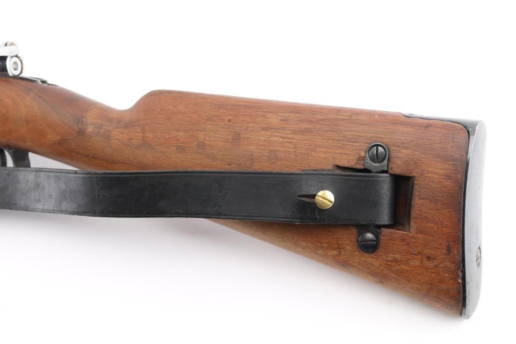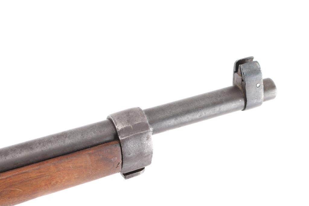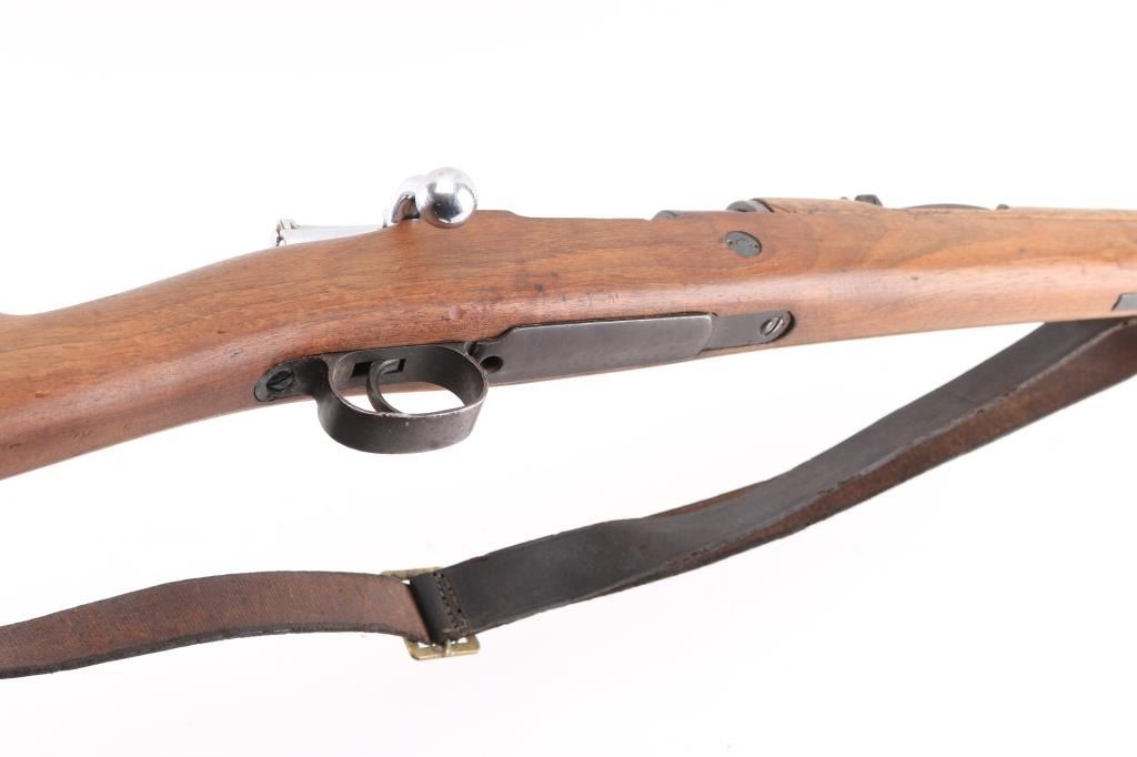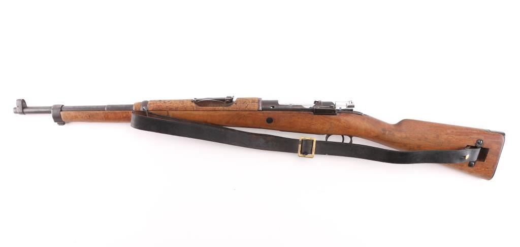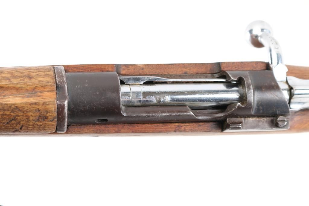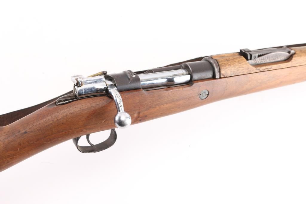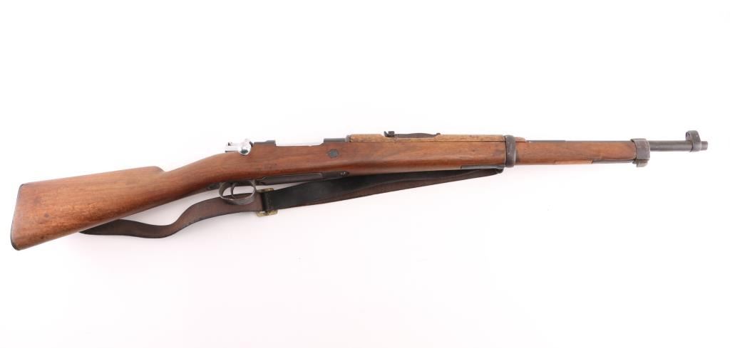 Spanish Military issue rifle chambered in 7mm. Produced 1893-1951. Mauser style action. 21.7" barrel with tangent rear, and protected front blade sights. Chrome turned down bolt, no cleaning rod. 5-rd fixed box magazine. Bore is good, a little dirty, strong rifling. Action is smooth/tight. Wood stock and handguard are fair with minor dings and dents. Blued finish has dulled, about 85%%. Smooth steel butt plate with some pitting. NRA Condition-Very Good. C&R Firearm.