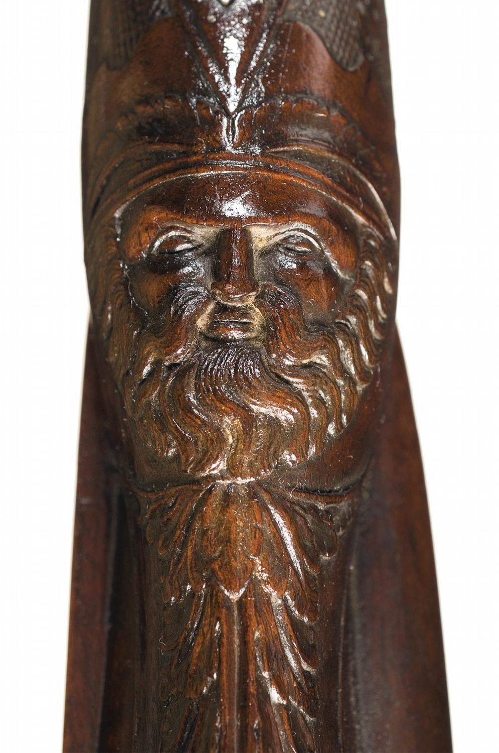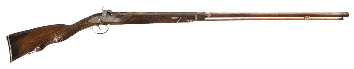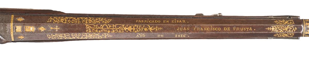 Inlaid gold blade front sight, surrounded by gold inlaid accents on the barrel, which has an engraved and gold filled floral band dividing the round and octagon sections, followed by inlaid floral scroll designs, "FABRICADO EN EIBAR./ JUAN FRANCISCO DE YRUSTA./ ANO DE 1816." on the flats, a series of six golden proof stamps at the breech, and a gold border ahead of the full coverage tang and breech engraving. Scroll and floral decorated lockplate, with "Francesco Nuti/ Cortona" below the bolster, a man's head engraved on the hammer screw, and a dog head engraved hammer. Scroll design reverse plate, with an inlaid silver border wire, and a floral and scroll engraved triggerguard. Half length stock, with iron headed ramrod, engraved gold and silver ramrod pipes, a horn tip with silver band, engraved silver wedge escutcheons, feathered carving ahead of the lock, checkered forearm and wrist with silver wire and star inlays, gold "TB" monogram on top of the wrist, a mans head on the underside of the grip, raised cheekpiece with floral carving and an engraved silver capped horn buttplate with additional silver band.