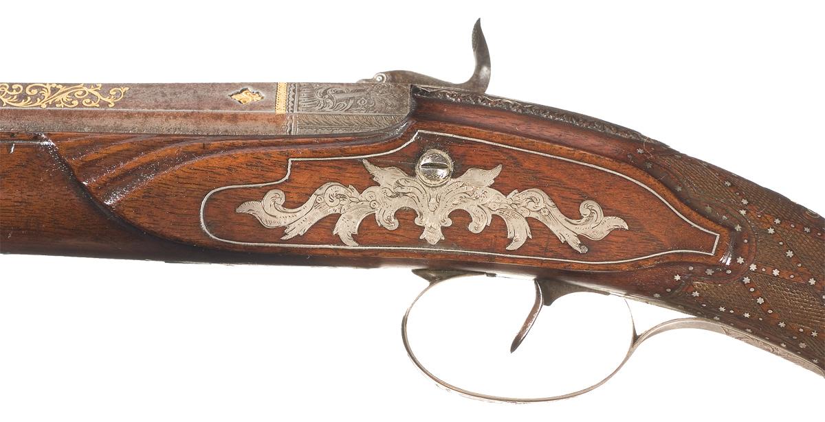Condition: Fine, with a mixed brown and gray patina, bright edge wear and some pitting around the nipple and muzzle. Silver parts are bright, with a darker patina visible in the lower engraved areas, and the gold is strong and finely detailed. Stock is very good, with a small chip next to the hammer, light scratching on the butt, and mild pressure dents. Mechanically excellent.