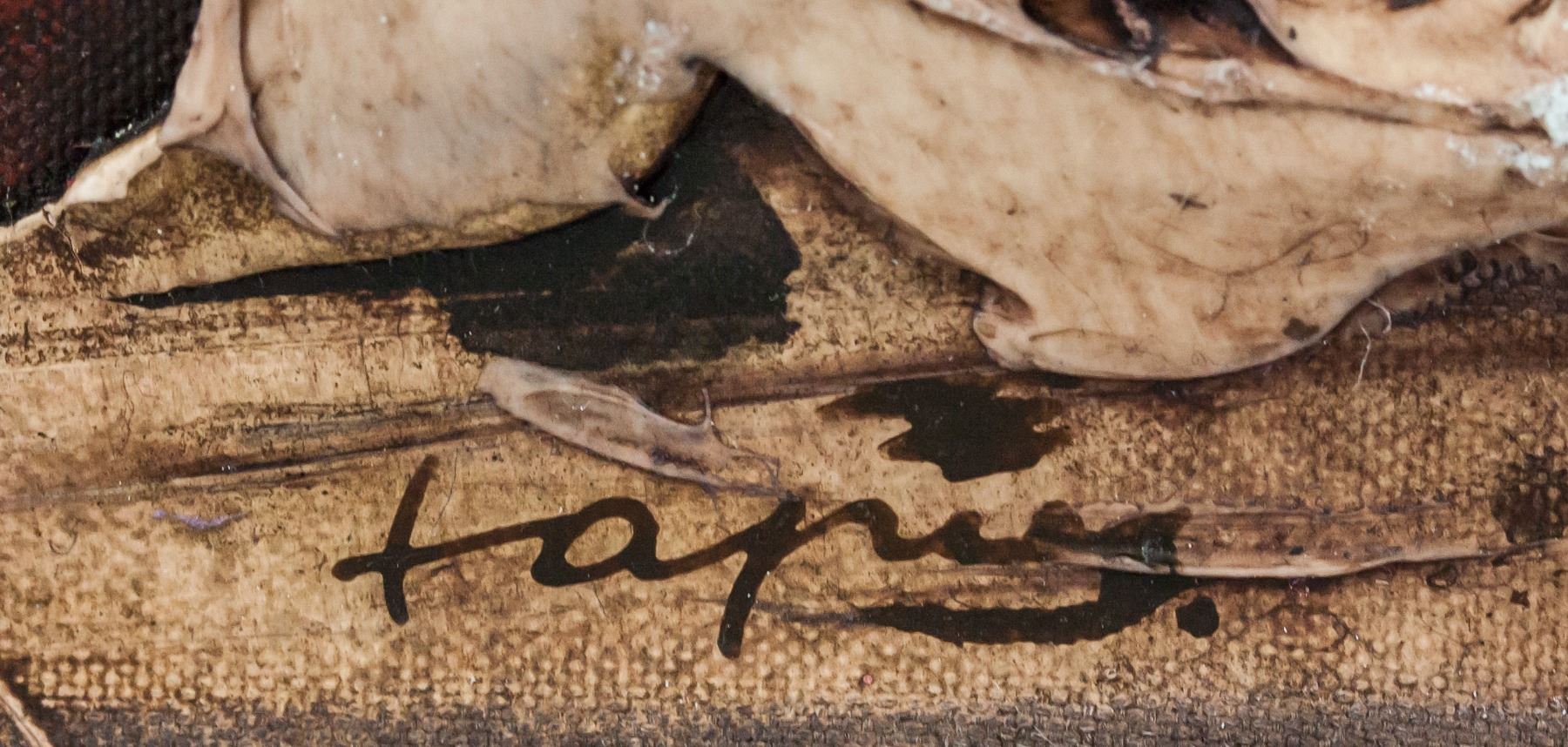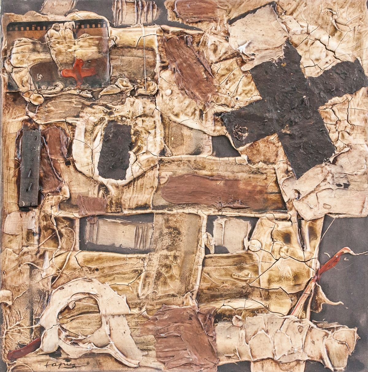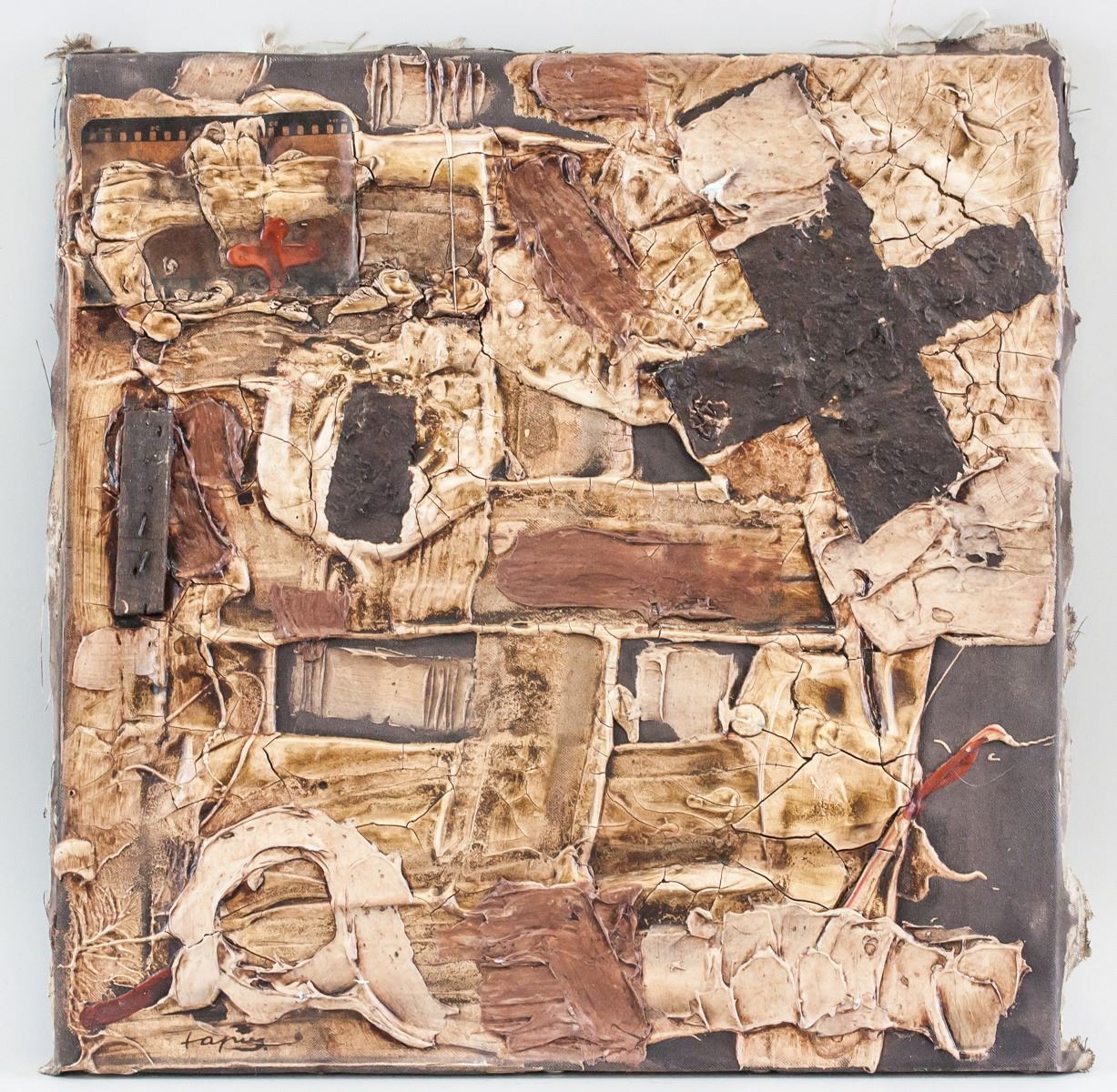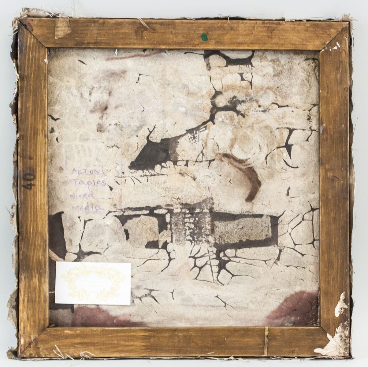Mixed media on canvas. Featuring abstract composition with great sense of texture. Signed "tapies" to the bottom left corner. "ANTONI Tapies Mixed Media" inscribed on verso. Label on verso reads "NORTH FOCUS ART HOUSE".41 x 40 cm (16 x 15.75 inches).