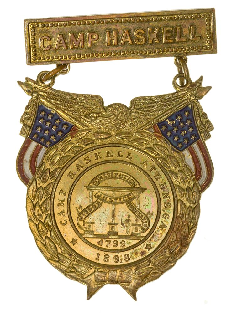 1898 A brass medal with red, white, and blue enamel work representing American flags, on a brass hanger that is embossed "Camp Haskell". The medal is embossed with the image of an eagle flanked by the enameled American flags, and the center is inscribed "Camp Haskell Athens, GA/ 1898/ Constitution/ Wisdom Justice Moderation/ 4799". The reverse is embossed "C. M. Robbins/ Maker/ Attleboro, Mass./ U.S.A." During the Spanish American War, Camp Haskell was organized for the 1st Brigade, 3rd Division, 2nd Army Corps for its winter encampment, and was named for Brigadier General Joseph T. Haskell, USV, in November 1898. The 3rd New Jersey Volunteer Infantry Regiment was the last to use the Haskell Camp, which closed upon their departure on 11 February 1899. - HKA#64901