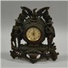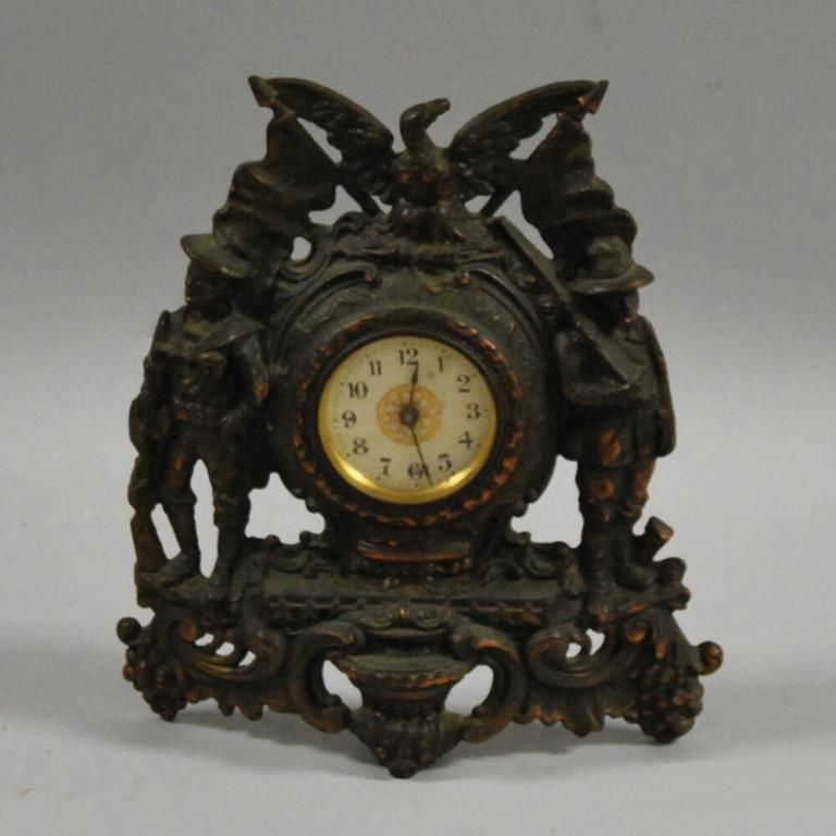 Cast Metal Spanish-American War Commemorative Table Clock, ht. 10 1/2, wd. 9 1/2 in. Unmarked fixed key wind, 8-day spring-driven brass movement with printed paper dial with Arabic numerals, bronzed cast iron case with spread-winged eagle surmount, flanked by U.S. flags with sailor at left and soldier at right on urn and scroll work base, in original copper finish.