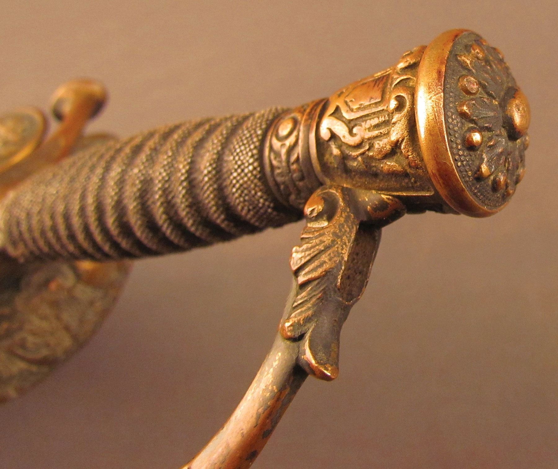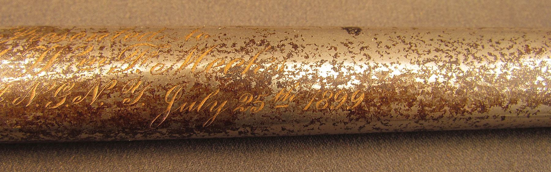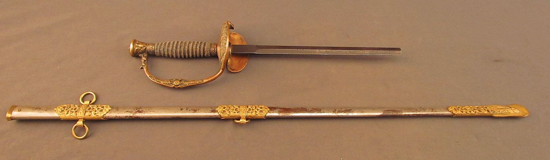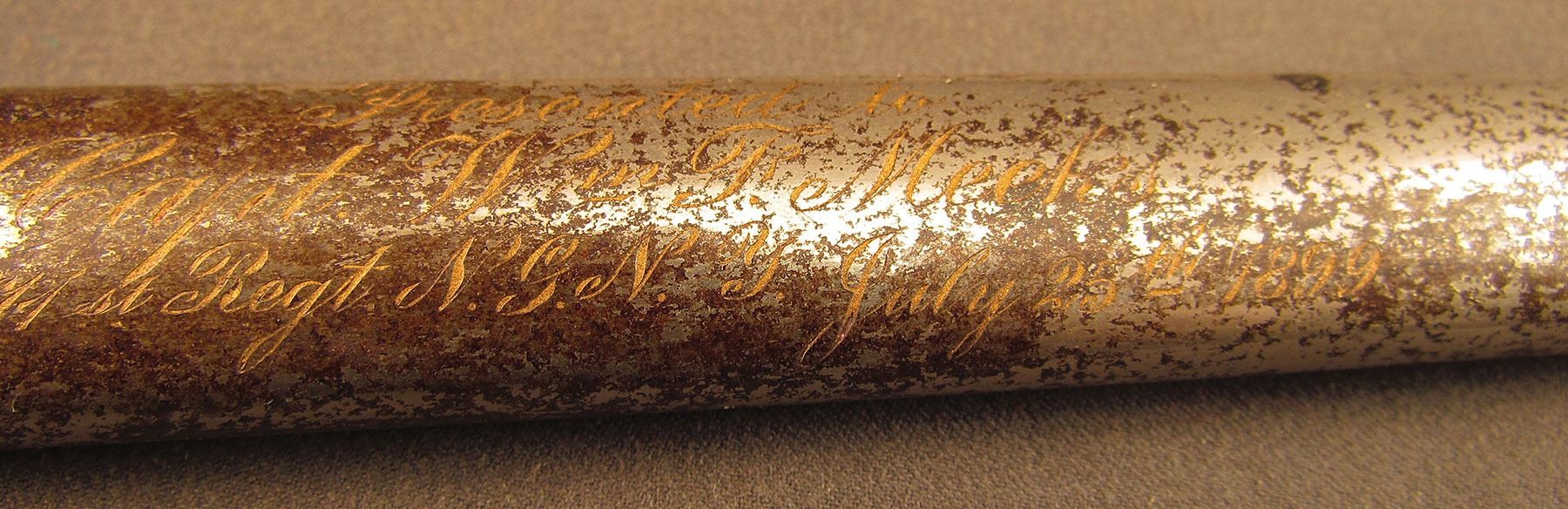 Broken presentation sword given to Capt. William F. Meeks by his company, consisting of the hilt and forte section of the blade, measuring 17 1/4” overall. The remaining portion of the blade has a dark plum-brown patina with visible etched decorations and retailer's mark at the ricasso: “The Warnock Co., New York.” The hilt has a folding counterguard, single forward swept quillon, and urn-shaped pommel. The brass has an overall ruddy-brown patina with traces of the original gold finish remaining on protected areas. The grooved shagreen grip is in very good condition, with very little surface wear, but the braided wire wrap is missing. The metal scabbard retains 70–75% of the original nickel finish with mottled dark brown on the balance. The brass hanger bands, throat, and drag are in fine condition, and there is a gold filled, engraved presentation between the bands that reads: “Presented to Capt. Wm. F. Meeks by Co. I, 71st Reg't. N.Y.N.G. July 25th 1899.”