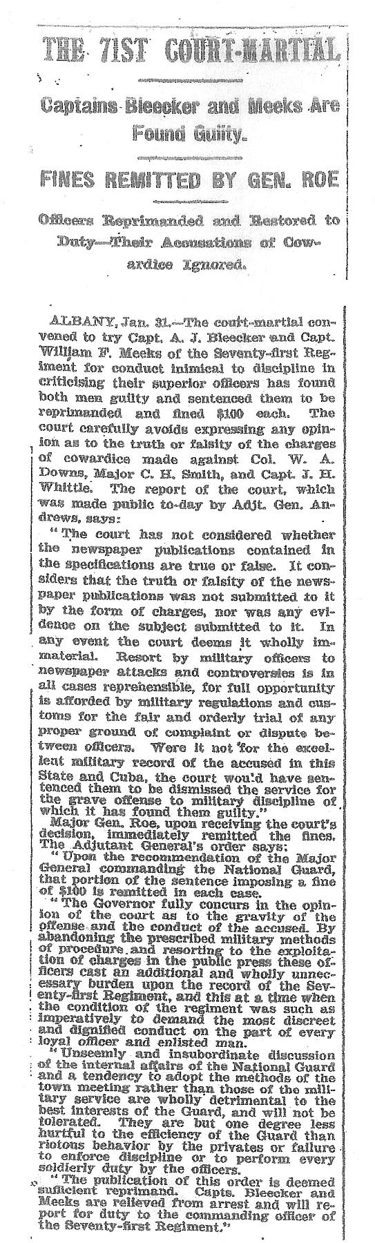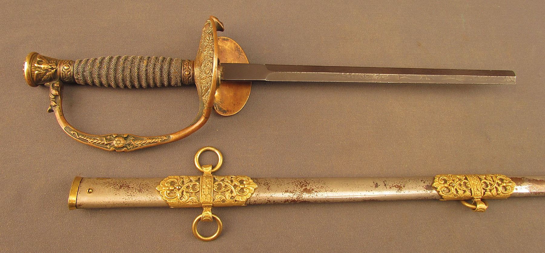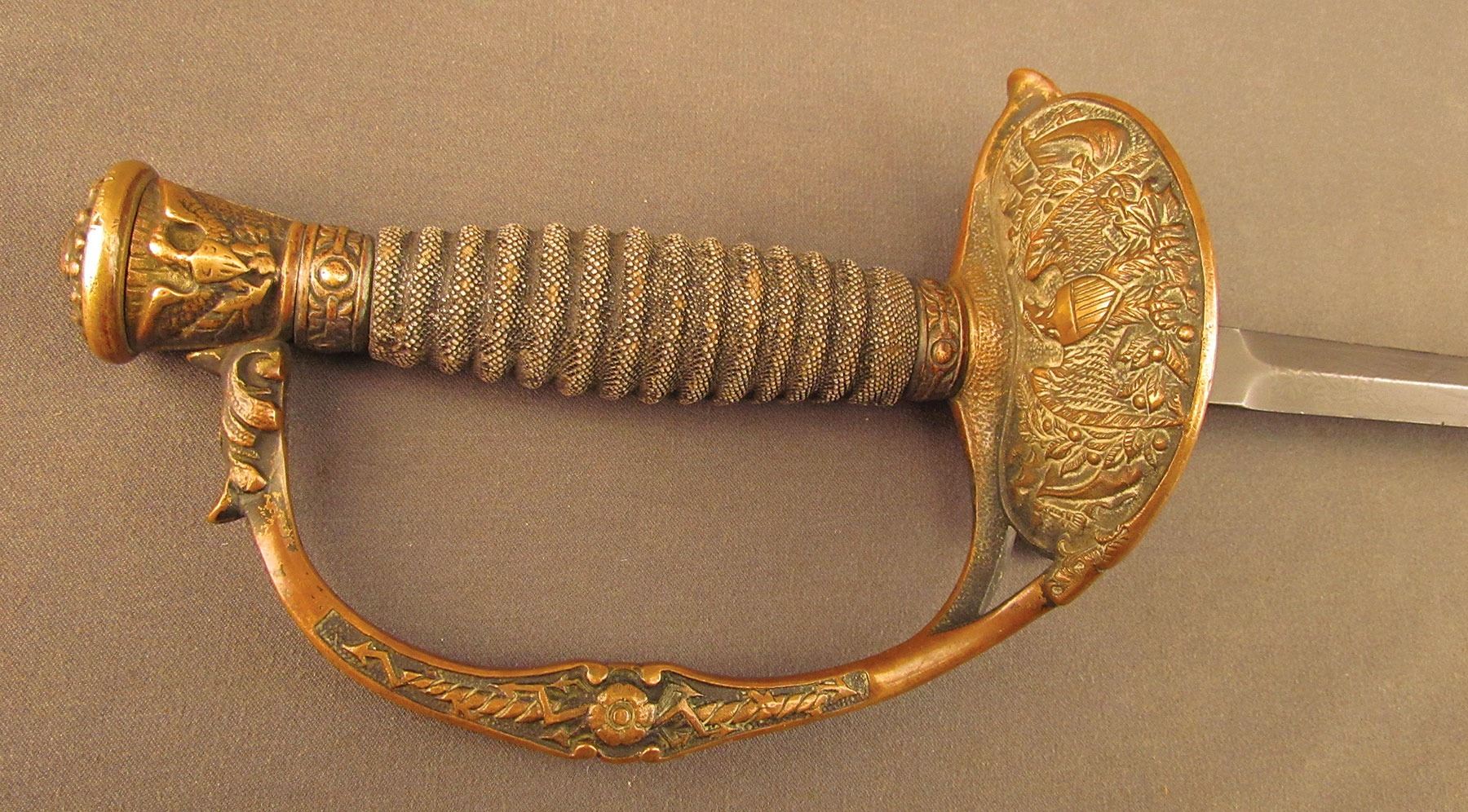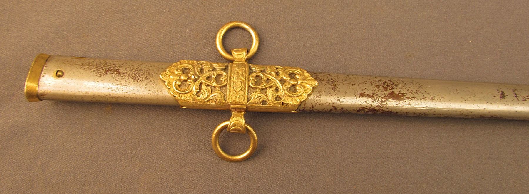 William Furman Meeks enrolled in a two-year enlistment on May 2, 1898, and mustered in as Captain of Co. I on May 10. He mustered out with the company on November 15, 1898, and served the remainder of his term in the quartermaster staff of the 26th US Volunteer Infantry. The 71st NY was one of the first volunteer regiments to muster for service against the Spanish and were among the units that were deployed at the Battle of San Juan Hill. Great controversy arose afterward concerning the conduct of the regiment during the battle, and only a few of its elements actually made it to the top of the San Juan Heights during the actual fighting, and then only due to the individual initiative of a few of the lower ranking officers. According to the regimental history, Capt. Meeks was one of these, and he led Co. I to the top without direct orders to do so (Teddy Roosevelt himself commented on the behavior of the regiment: ‘The greater part of the Seventy-First of their own free will took part in the storming of San Juan Hill, and showed that no matter how cowardly their officers might be, they were willing to obey their country's call’). After the return of the regiment to New York, recriminations were flung rather fiercely and it was not long afterwards that Capt. Meeks was court-martialed, along with another company commander, Capt. A. J. Bleeker, for leveling public charges of cowardice against the senior officers in command. Meeks and Bleeker were both found guilty, and received both reprimands and monetary fines, but were retained in the service. It is interesting to note, however, that the officers they had disparaged soon tendered their resignations. This is an extremely interesting US sword with a connection to a controversial volunteer officer, and would make a great addition to any collection.