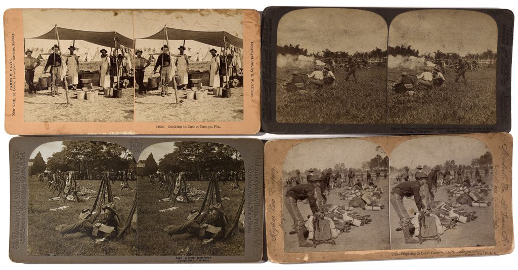 Lot of 4: 1) View of the New York 2d Volunteer Infantry preparing to leave camp. Published by the Keystone View Co., 1898. Blank on reverse. On cream colored board, 7" x 3.25". 2) View of an infantryman reading "A letter from home." Published by C.H. Graves, 1898. With embossing on gray board. Blank on reverse. 7" x 3.25". 3) A view of "Heroic Washington Volunteers advancing-Filipinos 800 yards in front-Taguig Philippines." Published by Underwood & Underwood, 1890. Crease at top. On gray board with description on reverse. 7" x 3.25". 4) A view of men "Cooking in Camp, Tampa, Fla. Photographed and published by B.W. Kilburn, Littleton, NH, 1898. Slight staining at top. On peach board with publishing info on reverse.