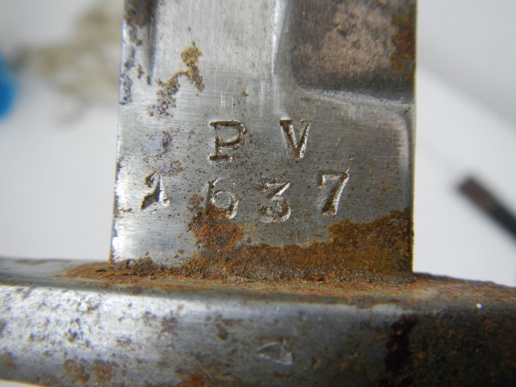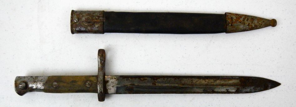 Spanish Artillery Bayonet - This Bayoney is 14.75" and has the original leather scabbard. The piece has surface rust and was used in battle. The makers mark is, "Artilleria (a Crown with canons underneath crossing) Fabrica de Toledo." The age of this piece is unknown.