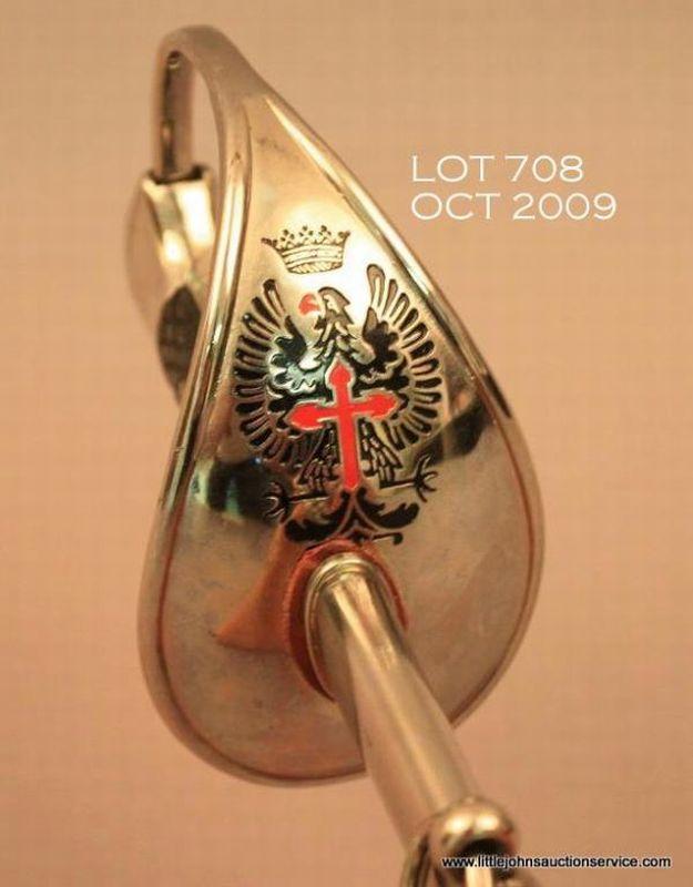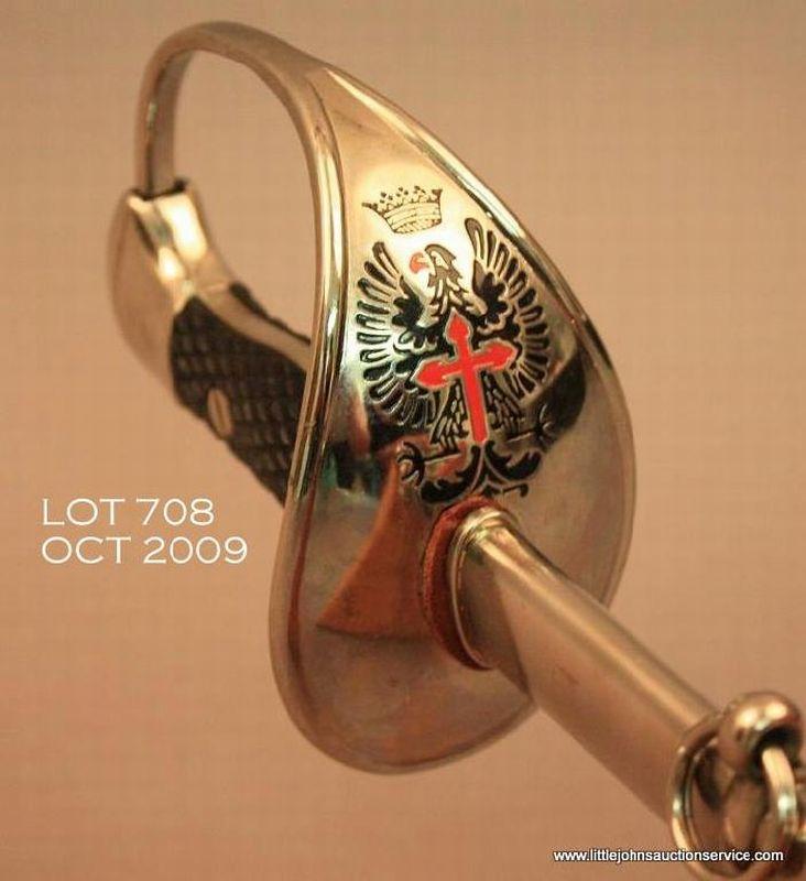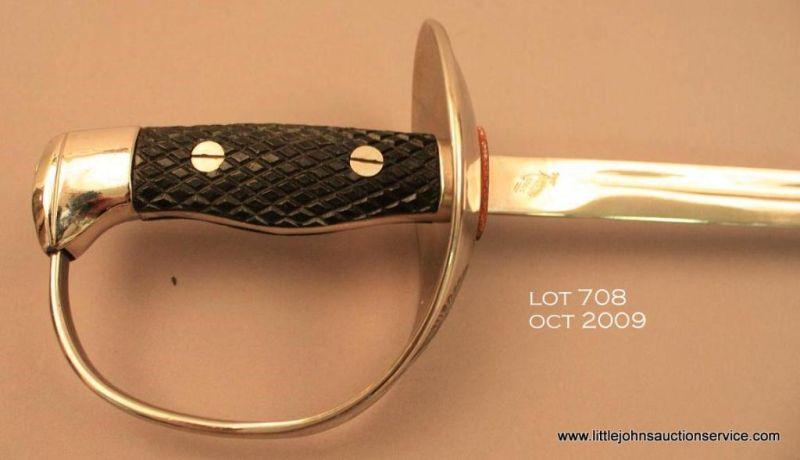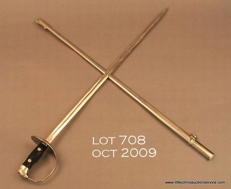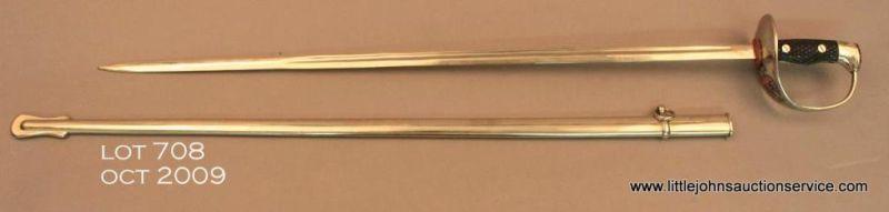 Spanish Artillery sword and metal scabbard in overall very good to fine condition showing little use or handling; approx. 37” overall, very good blade, fine guard and grip, fine scabbard which is nickel plated as is the guard and pommel;checkered wood grip. The front of the guard shows an enameled Spanish royalty crest with crown. Est.: $100-$200.