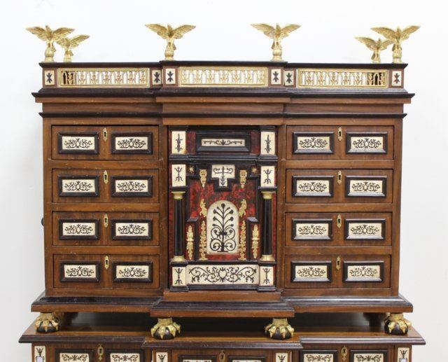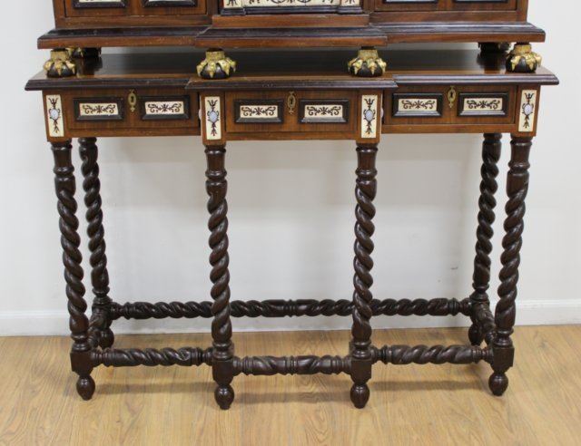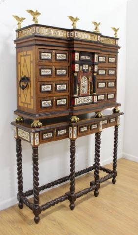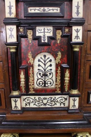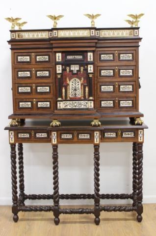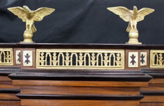 Bone inlaid and ebonized. Bronze eagle cornices on a matching stand. Paw feet. Approx. 76 1/2" H x 49" W x 15 1/2" D.