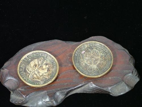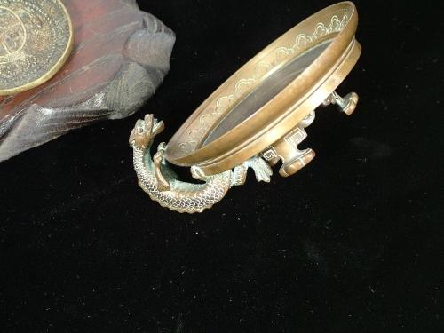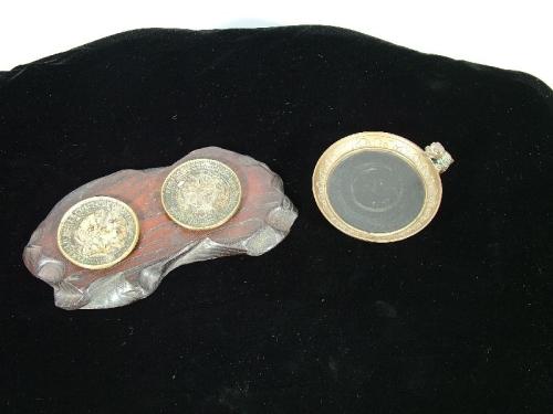 (Spain Early 20th Century) Brass holder with carved dragon, and two carved brass coins on a root stand, 2 1/2" by 9".