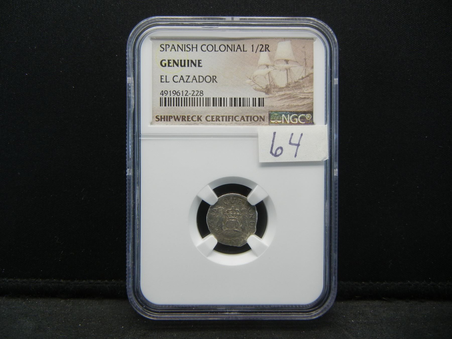 Spanish Colonial 1/2 Reale El Cazador Ship Wreck NGC Genuine