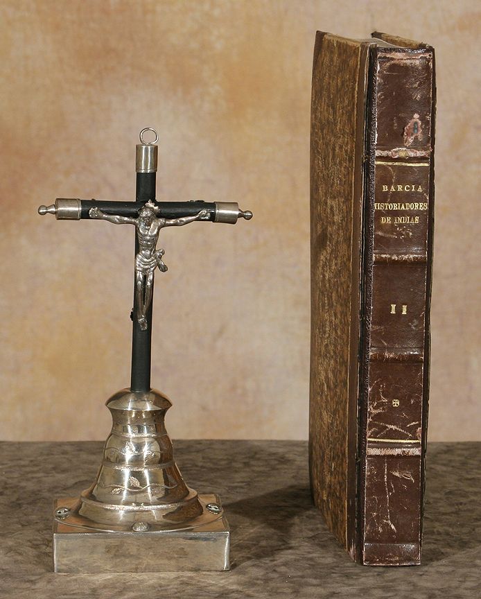 Spanish Colonial Christo & Indian History Book. Christo is 9" x 5" with a silver Christ on a black wooden cross. Mounted on an engraved silver base 4" x 4". Book is Historia de las Indias (History of the Indians). By Francisco Lopez de Gomara, published in Madrid in 1749. (est. $500-700). CONDITION REPORTS: www.auctioninsantafe.com/docs/cr2012.pdf