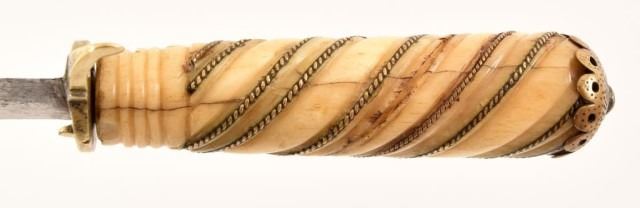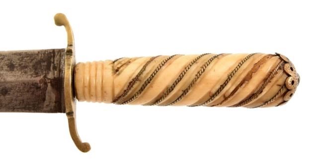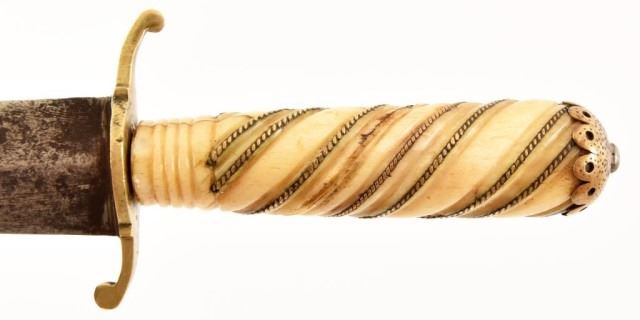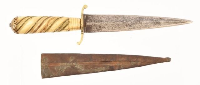 Double edged blade, Brass S guard and wire entwined on handle, Circa 1830. Blade length: 5.25", Overall length: 9.5"
