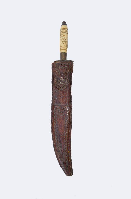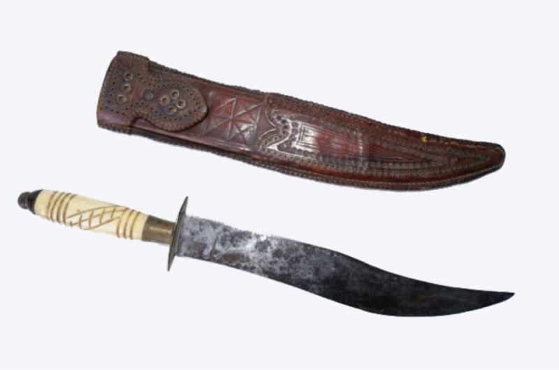 Early Gold-Rush days knife (circa 1840's) with unusual "toothpick" shaped blade, heavily embossed sheath, both in excellent condition. Notice whale bone handle with early nautical carving, 17" overall.