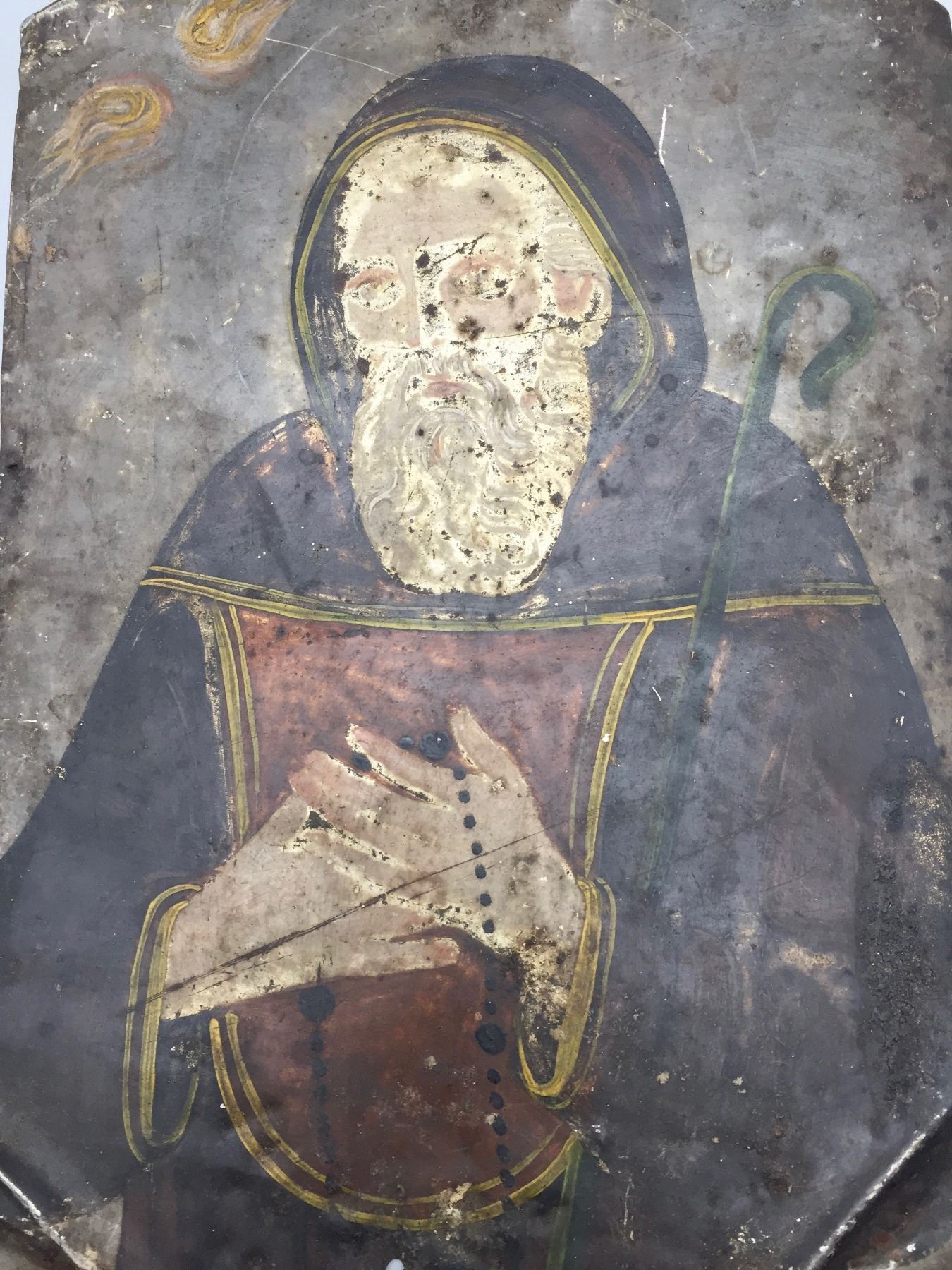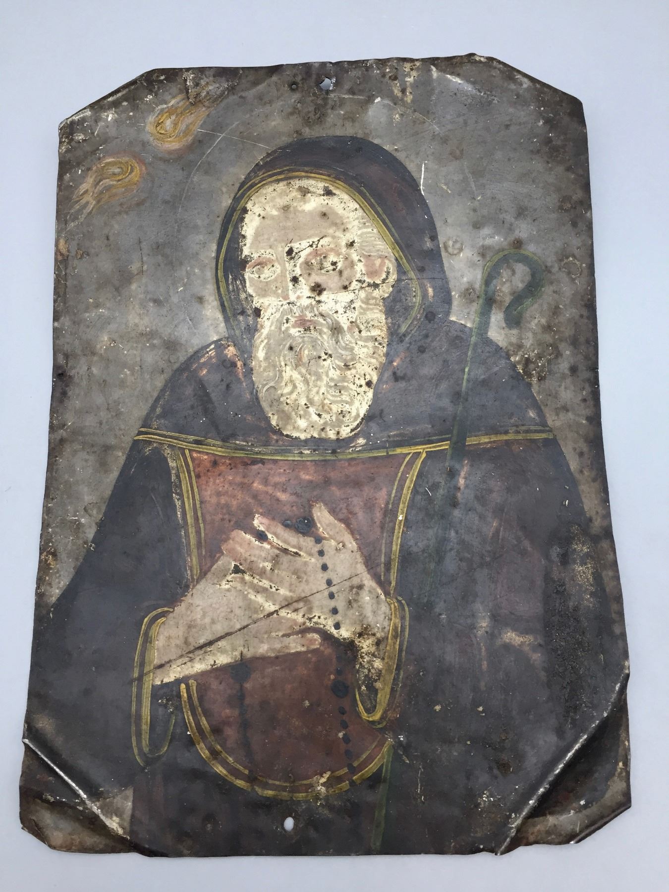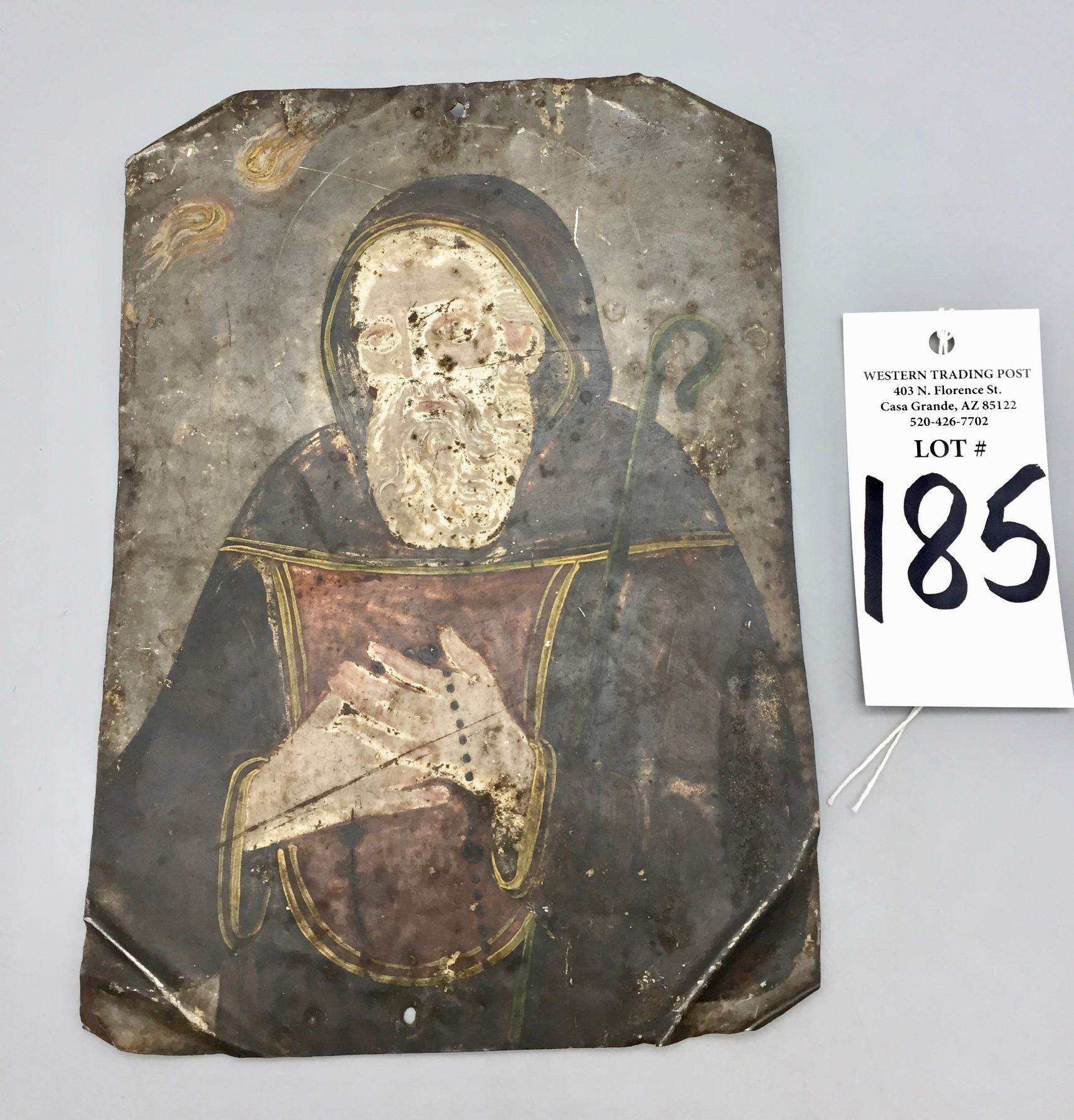 Description: Presented for your consideration is this Spanish Colonial “Retablo”. It is painted on tin. Mexican or Spanish “Retablos” of the 19th century are small paintings, usually done on tin, by folk artists with minimal artistic training. The Spanish word retablo is derived from the Latin retro-tabulum, meaning "behind the table," that is, a behind the altar painting. Maker: Unknown. Approx. Age: Circa Late 1700s to early 1800s. Size: 7”w x 10-7/8”long. Condition: Good for its age, normal wear expected. Please look closely at the pictures - they are an important part of our description. Shipping: There will be a $5 handling / packaging fee for shipping this lot. The actual cost of postage will be added on top of that.