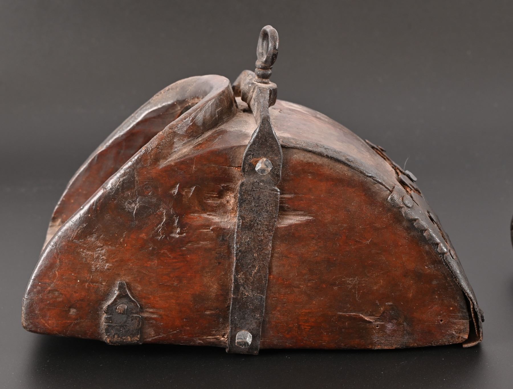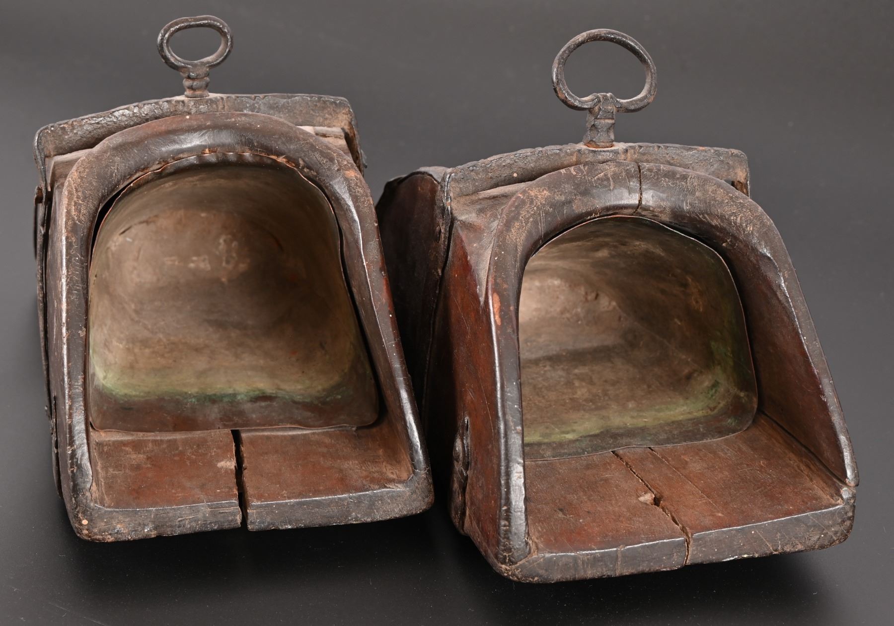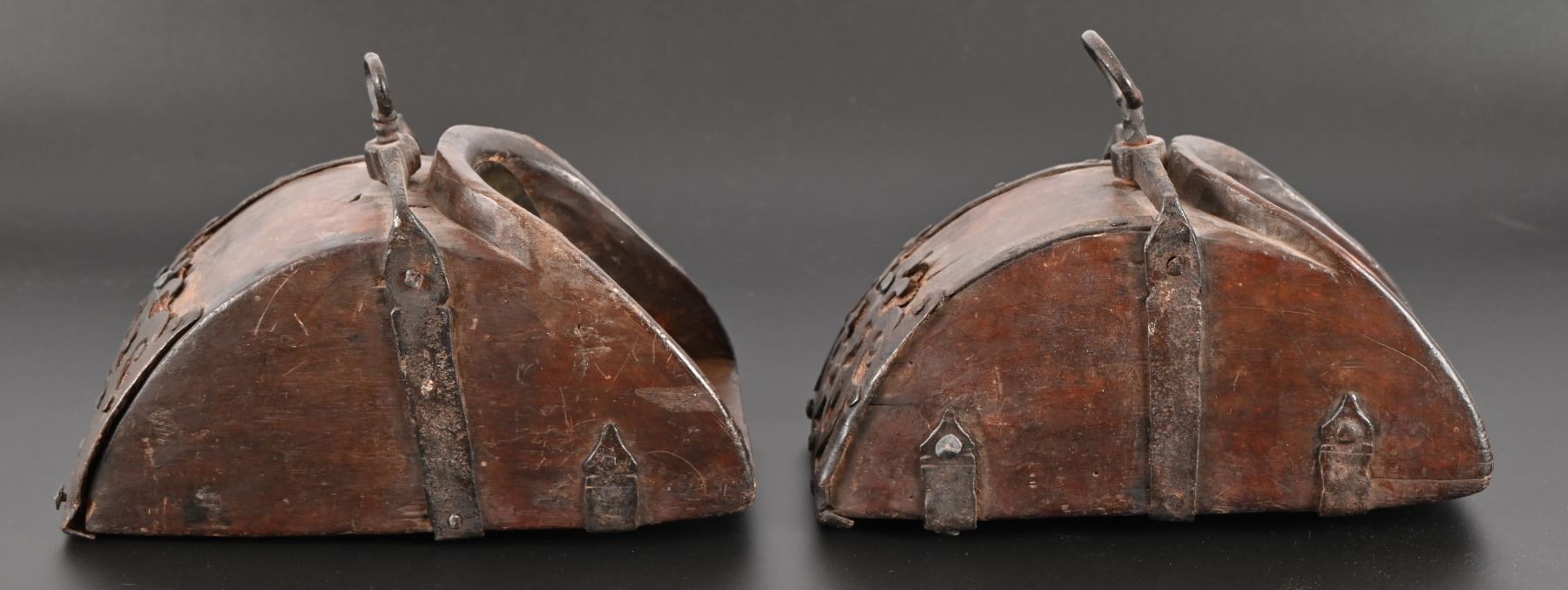 Hand forged decorative iron reinforcement over hand carved Spanish Colonial wooden stirrup. Measure approximately 6" x 7" x 10.5"