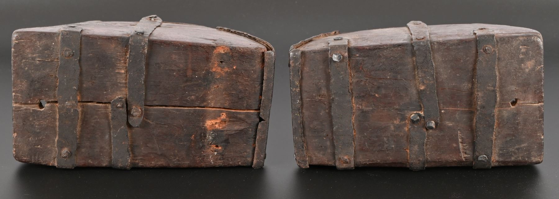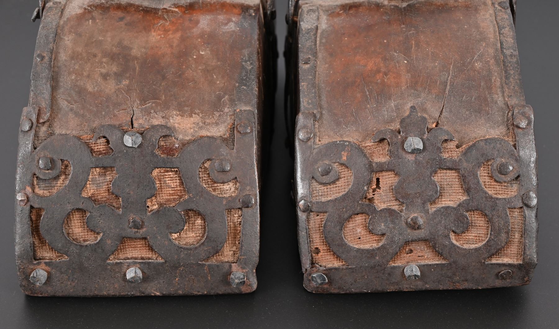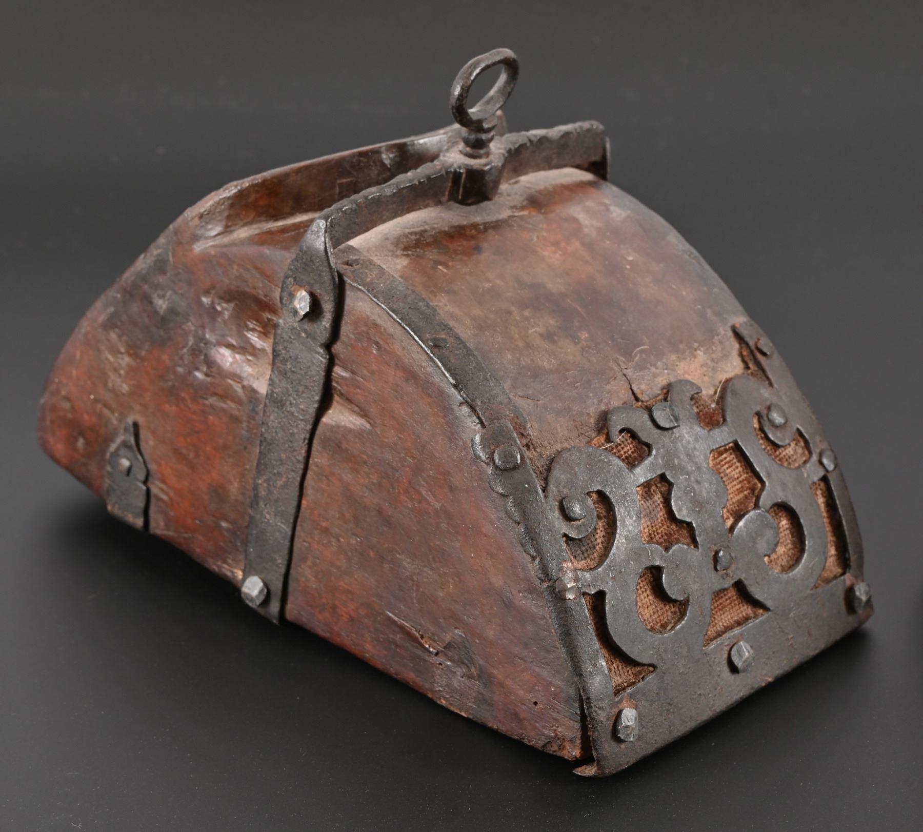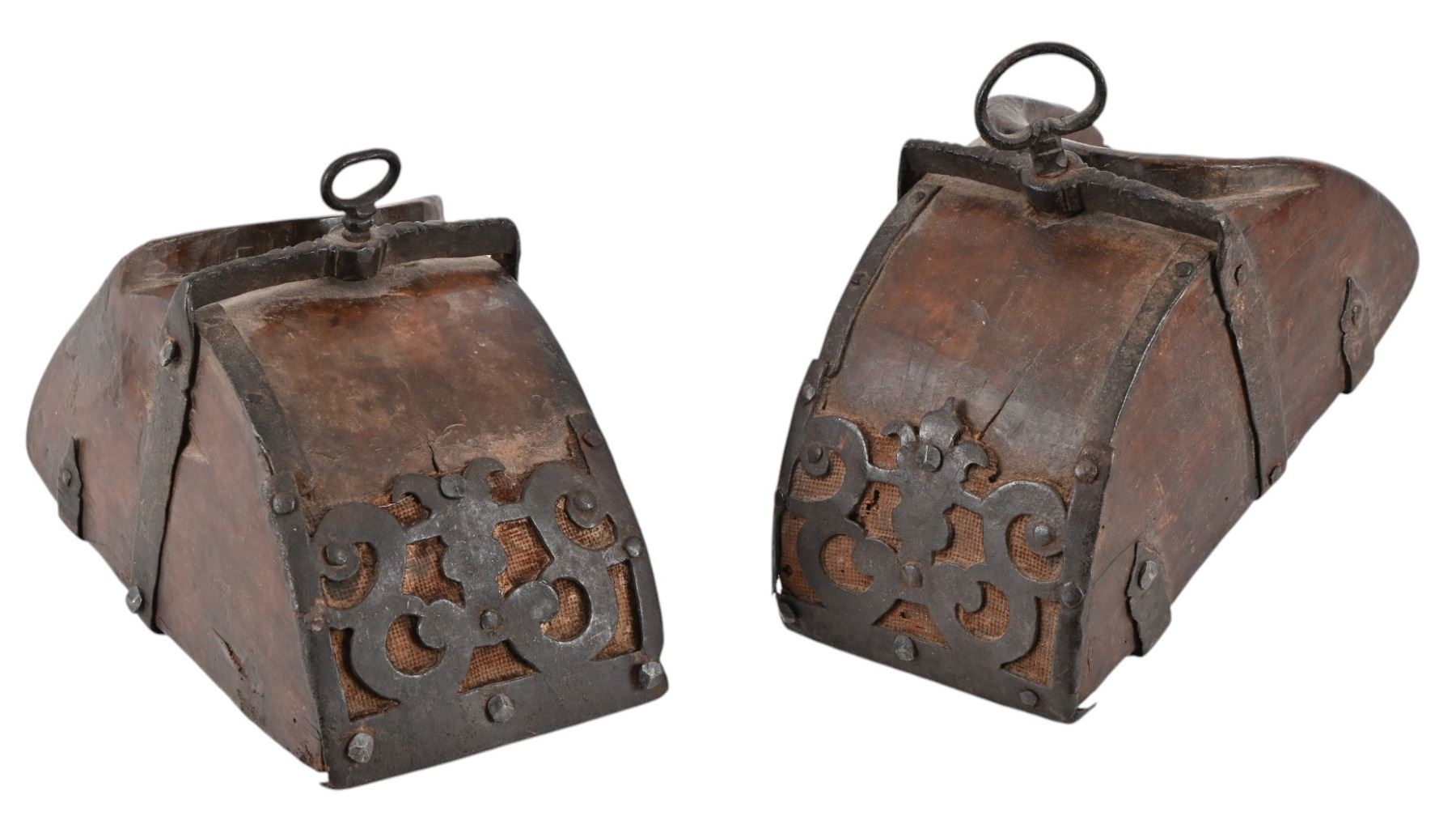 Hand forged decorative iron reinforcement over hand carved Spanish Colonial wooden stirrup. Measure approximately 6" x 7" x 10.5"