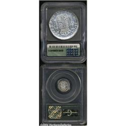 <B>Spanish Colonial Silver Pair, </B></I>Mexico Ferdinand VI Pillar 1/2 Real 1751-M KM67.1, MS63 PCGS, very scarce grade, and Peru Carlos IV 8 Reales 1804-JP, XF45 ICG, very boldly struck, but lightly cleaned. 2 coins <BR><BR><B>Important notice:</B> Heritage usually auctions material at the rate of 200-250 lots per hour. On some occasions eBay Live bid software or the Internet may not be able to keep up with the pace of the auction. We recommend placing a realistic absentee bid now as insurance to avoid disappointment. Occasionally the auctioneer may eliminate or reject an eBay Live bid, and the auctioneer may also reopen a lot after the close of the eBay live bidding (usually because we missed an audience bid), and may reject your bid even if it shows you as the winning bidder. By bidding via eBay Live, you agree that Heritage may award the lot to another bidder at its sole discretion under the circumstances described above or any other reasonable circumstances. Since eBay bids are not shown to us until we open the lot on the floor, we treat those bids just like floor bids. In most cases the floor responds before the eBay bid is presented to us, due to Internet lag time, so for consistency we have made it a policy that floor bids are always considered first over tie eBay live bids. Also please note that all Heritage lots purchased through eBay Live carry a 20% Buyer's Premium. Please make sure you read the Terms and Conditions before you bid.