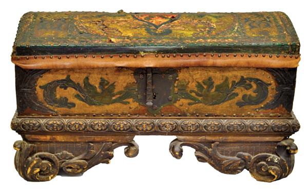 Spanish Colonial chest circa 1790, of rectangular form, the wood carcase overlaid with cuir bouilli polychrome decorated with birds amidst intricate interlacing foliate scrolls, iron lock plate, hasp, straps and carrying handles, above the carved base with stylized rosettes and terminating on scroll carved block feet, 23''h x 40''w x 20''d