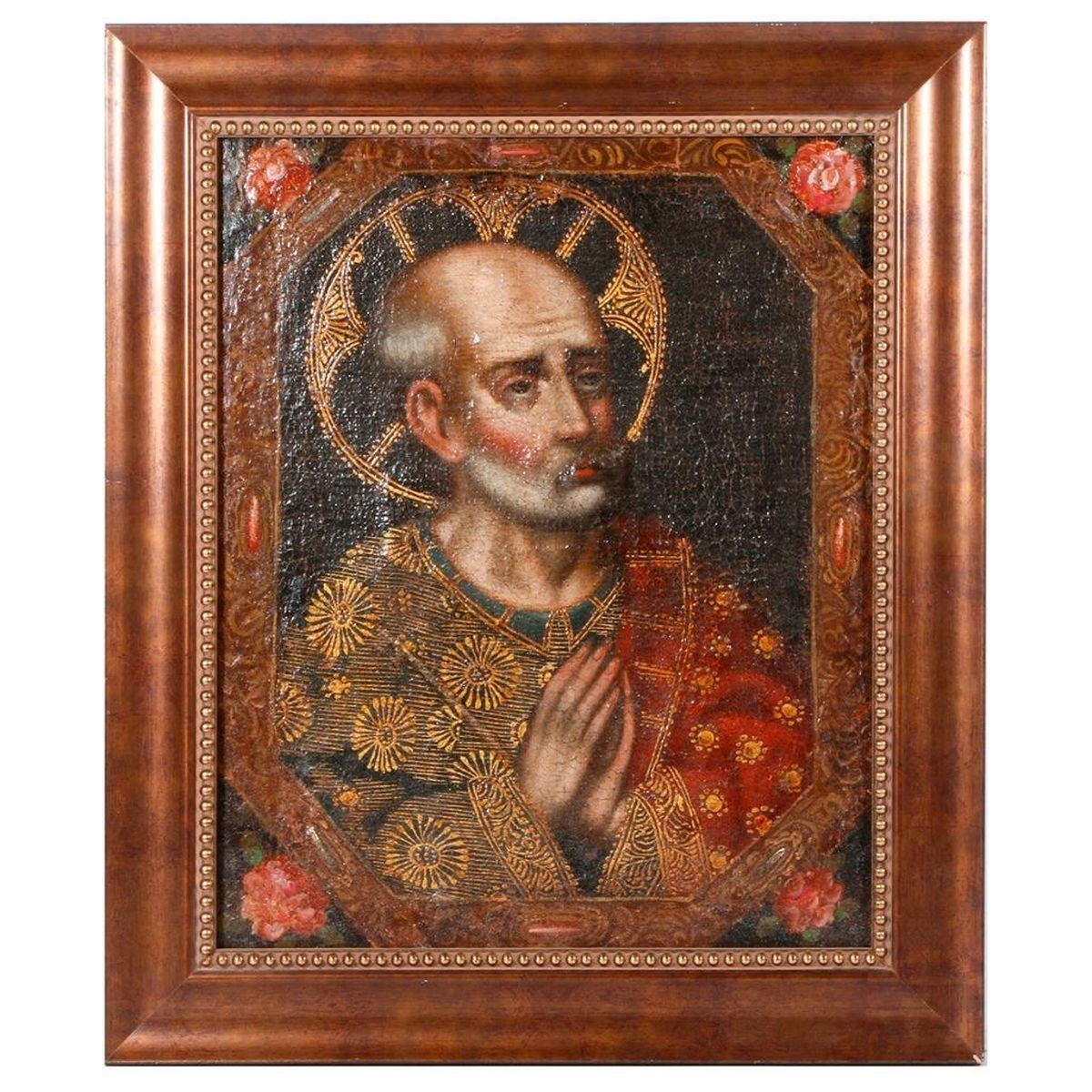 c. 19th century, on canvas, depicting a male saint in luxurious clerical robe with gold details. Frame 20 inches high x 17, image 16 inches high x 14.