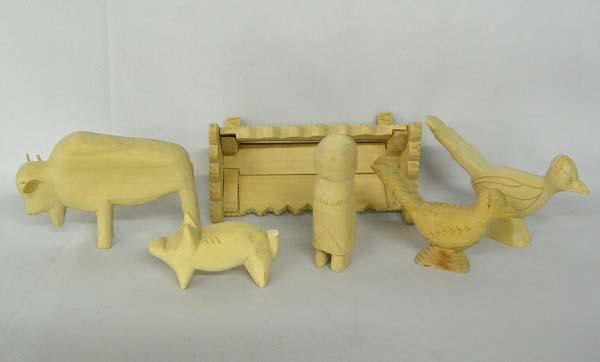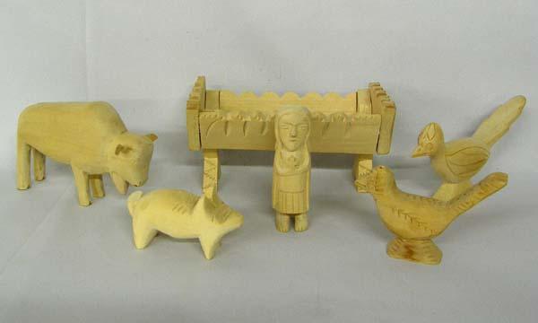 Collection of New Mexican Wooden Folk Art, includes woman holding cross, roadrunner, bird, pig, buffalo (ear and horn repaired), and cradle, largest measures 4.75'' x 7.75'', by artist Joe Mondragon Cordova, NM. SHI $25.
