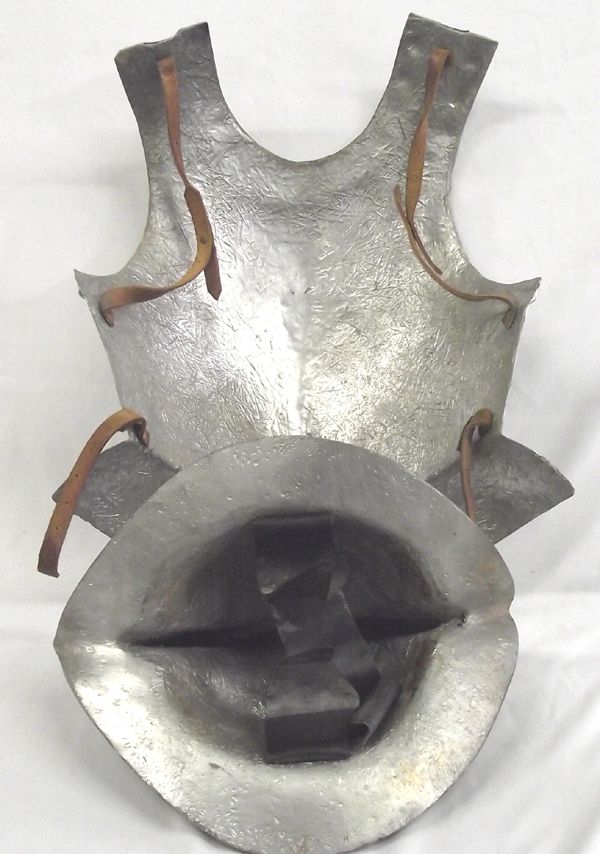 Spanish Conquistador Breastplate & Helmet Replicas. Fiberglass molded pieces, likely movie or stage props. Full size.